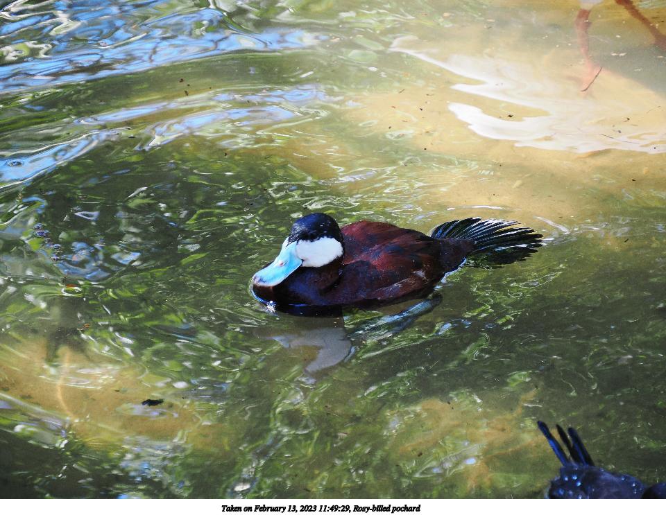 Picture #1: Rosy-billed pochard 960x743, 148,534 bytes (146K), (html file) OM OM1 camera with Olympus-m43 12-200mm f/3.5-6.3 lens f/6.3, ISO 1000, 1/125 sec, 149.0mm, auto mode, vivid color, center weight metering, auto + manual focus, IS Auto, anti-shock 35mm equivalent focal length 299.0mm Programs used: crop, raw therapee Taken by Michael Meissner on February 13, 2023 11:49:29 Last modified on May 20, 2023 at 20:57 |
