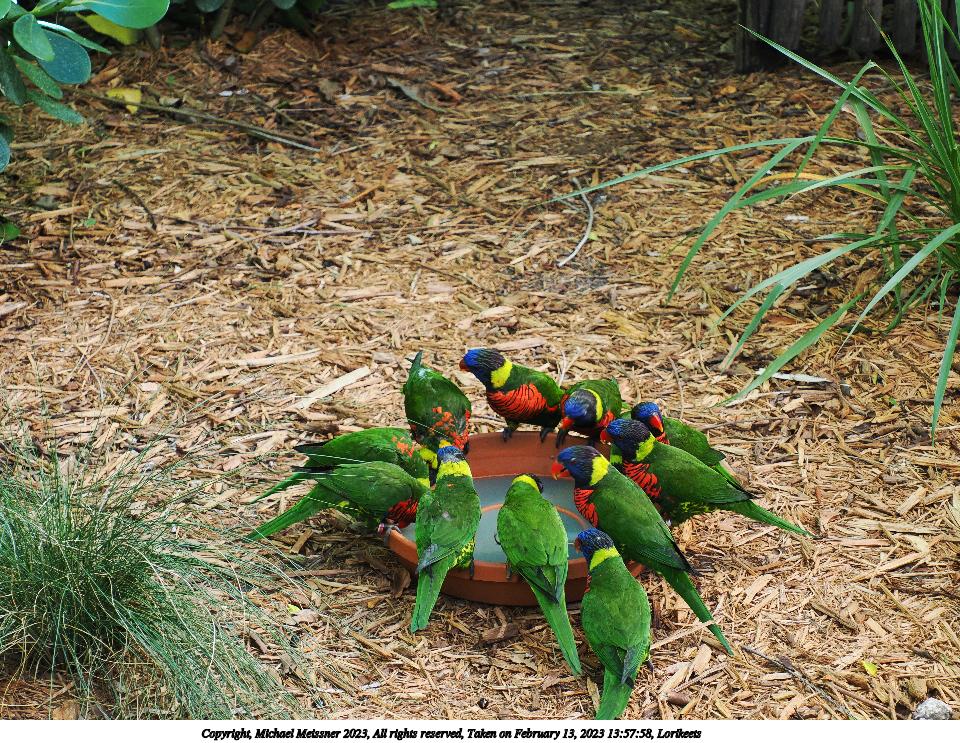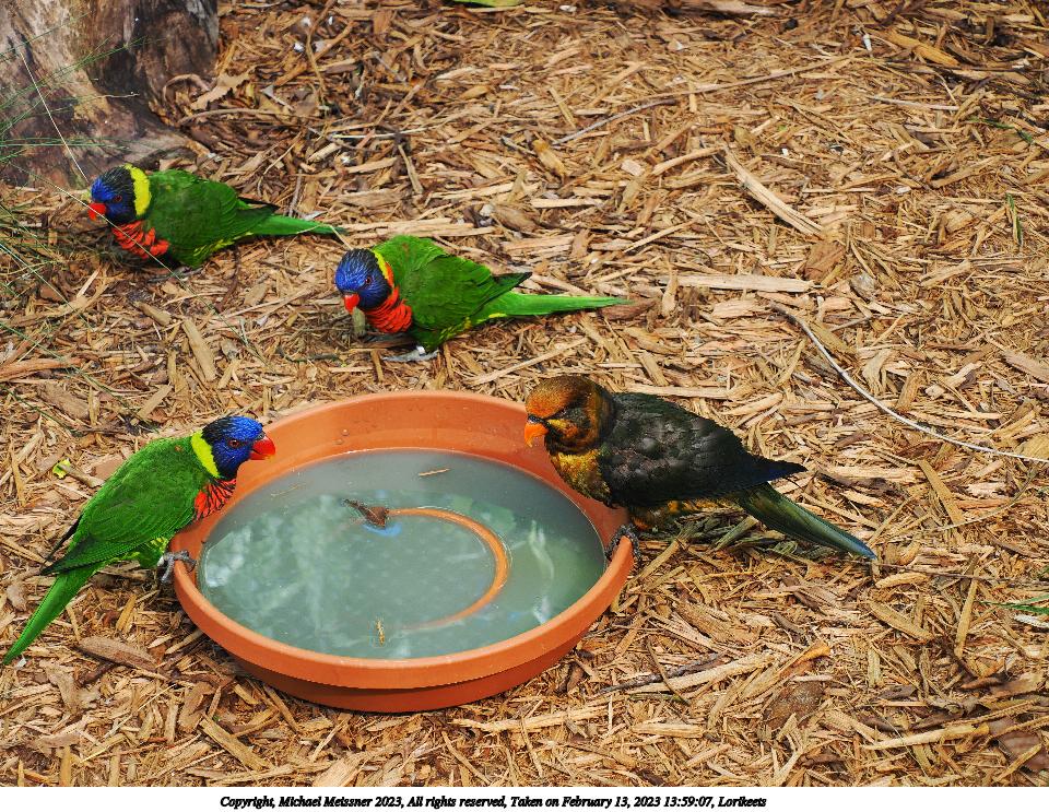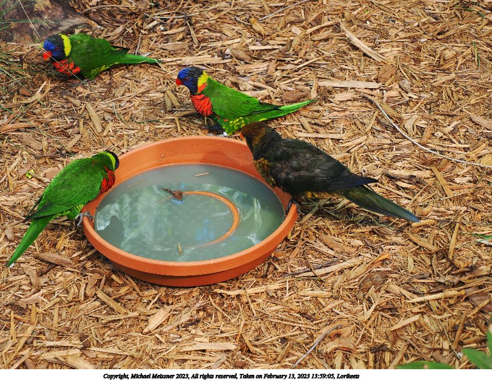 Picture #3: Lorikeets #3 960x743, 297,215 bytes (291K), (html file) Copyright, Michael Meissner 2023, All rights reserved OM OM1 camera with Olympus-m43 12-200mm f/3.5-6.3 lens f/5.6, ISO 400, 1/125 sec, 40.0mm, auto mode, vivid color, center weight metering, auto + manual focus, IS Auto, anti-shock 35mm equivalent focal length 80.0mm Programs used: crop, raw therapee Taken by Michael Meissner on February 13, 2023 13:58:31 Last modified on May 20, 2023 at 20:58 |
