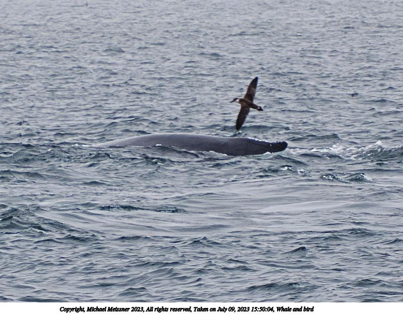 Picture #35: Whale and bird #2 Thumb: 480x360, 57,430 bytes (57K) Small: 800x623, 109,846 bytes (108K), (html file) Copyright, Michael Meissner 2023, All rights reserved OM OM1 camera with Olympus-m43 12-200mm f/3.5-6.3 lens f/8.0, ISO 200, 1/320 sec, 94.0mm, auto mode, vivid color, matrix metering, digital zoom x2, continous focus, IS Auto, face detection, anti-shock 35mm equivalent focal length 377.0mm, digital zoom x2 Programs used: crop, gimp, raw therapee Taken by Michael Meissner on July 09, 2023 15:50:05 Last modified on August 20, 2023 at 00:51 |