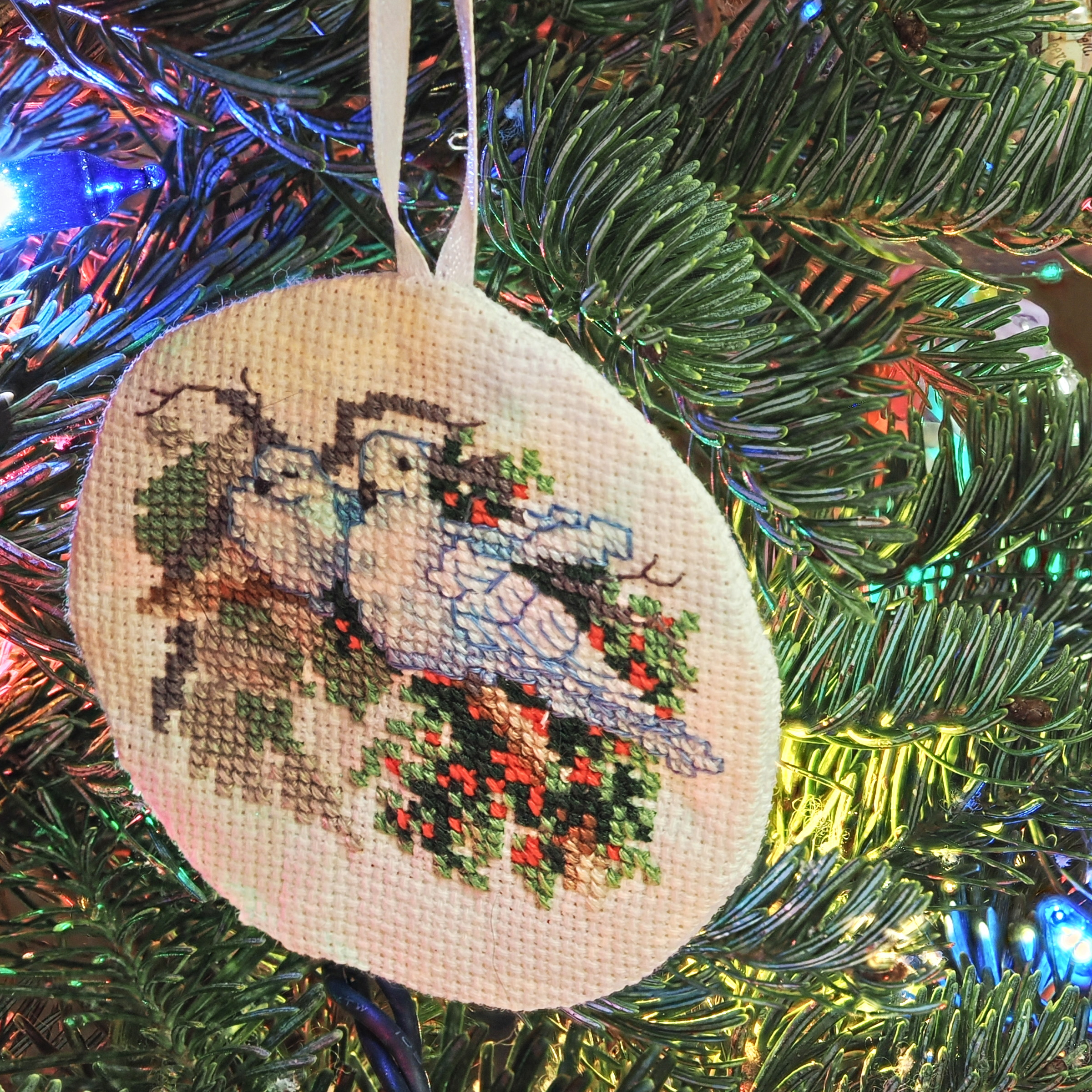Picture #11: Lovebirds ornament Thumb: 480x480, 102,698 bytes (101K) Small: 800x823, 232,957 bytes (228K), (html file) Large: 2400x2400, 5,113,827 bytes (4.9M), (html file) Copyright, Michael Meissner 2024, All rights reserved OM OM1 camera with Olympus-m43 60mm f/2.8 lens f/5.6, ISO 200, 2.5 sec, 60.0mm, aperture priority, vivid color, matrix metering, IS Auto, focus stacked 35mm equivalent focal length 120.0mm Programs used: gimp, raw therapee Taken by Michael Meissner on December 08, 2024 04:19:47 Last modified on December 08, 2024 at 21:53 My wife Liz embroidered the ornament |