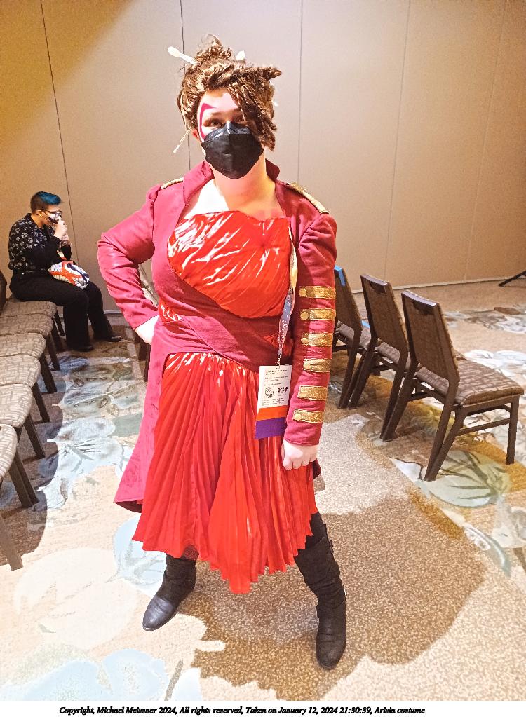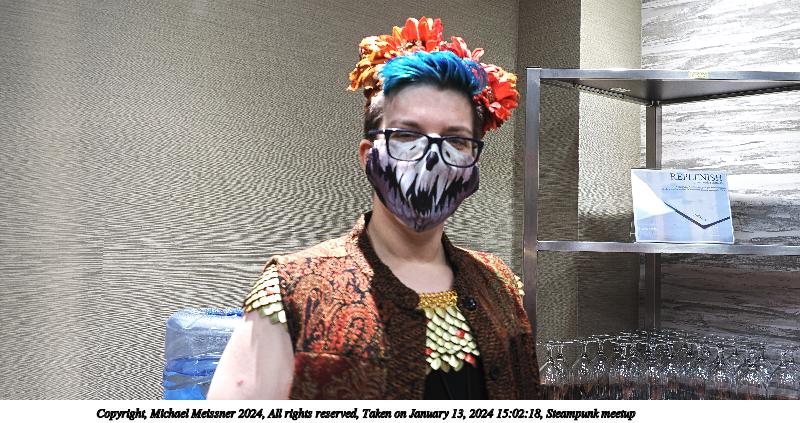 Picture #73: Masquerade entry #25 Thumb: 274x400, 35,520 bytes (35K) Small: 548x846, 86,580 bytes (85K), (html file) Large: 2000x2920, 2,632,556 bytes (2.5M), (html file) Copyright, Michael Meissner 2024, All rights reserved OM OM1 camera with Olympus-m43 12-40mm f/2.8 lens f/2.8, ISO 400, 1/125 sec, 32.0mm, auto mode, vivid color, center weight metering, continous focus, IS Auto, face detection, anti-shock 35mm equivalent focal length 64.0mm Programs used: crop, gimp, raw therapee Taken by Michael Meissner on January 14, 2024 20:52:23 Last modified on January 30, 2024 at 23:31 |