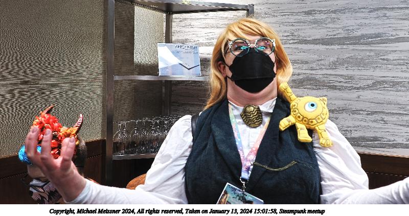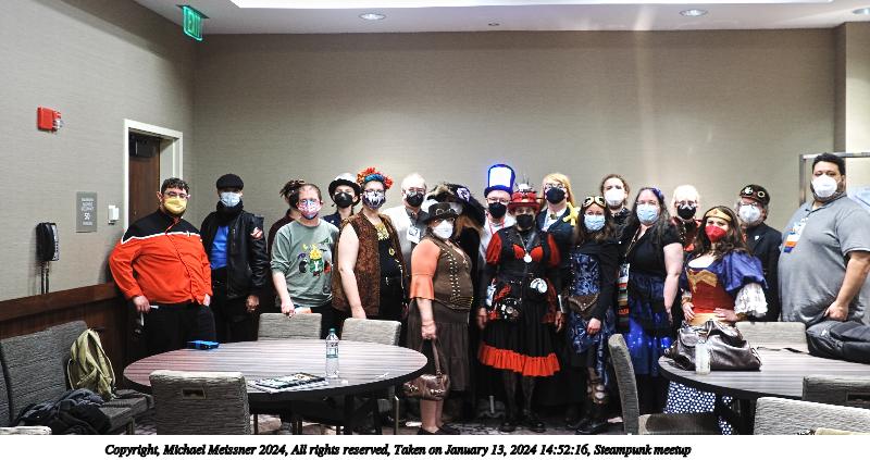 Picture #6: Steampunk meetup #4 Thumb: 500x375, 61,497 bytes (61K) Small: 1000x773, 149,018 bytes (146K), (html file) Large: 4000x3000, 2,287,508 bytes (2.2M), (html file) Copyright, Michael Meissner 2024, All rights reserved OM OM1 camera with Olympus-m43 12-40mm f/2.8 lens f/2.8, ISO 100, 1/4 sec, 15.0mm, auto mode, vivid color, matrix metering, manual focus, IS Auto, anti-shock 35mm equivalent focal length 30.0mm Programs used: crop, raw therapee Taken by Michael Meissner on January 13, 2024 14:59:06 Last modified on January 21, 2024 at 01:14 |