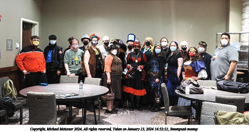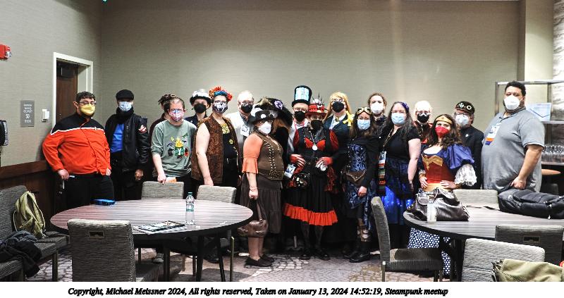 Picture #3: Steampunk meetup Thumb: 400x200, 42,648 bytes (42K) Small: 800x423, 92,510 bytes (91K), (html file) Large: 4800x2400, 2,303,410 bytes (2.2M), (html file) Copyright, Michael Meissner 2024, All rights reserved OM OM1 camera with Olympus-m43 12-40mm f/2.8 lens f/2.8, ISO 100, 1/4 sec, 15.0mm, auto mode, vivid color, matrix metering, manual focus, IS Auto, anti-shock 35mm equivalent focal length 30.0mm Programs used: crop, raw therapee Taken by Michael Meissner on January 13, 2024 14:52:16 Last modified on January 21, 2024 at 01:13 |