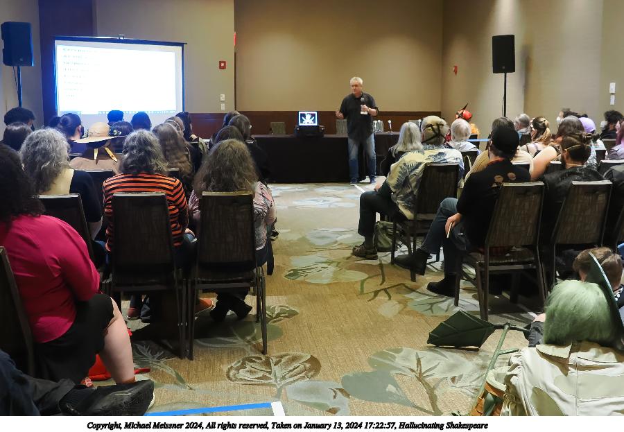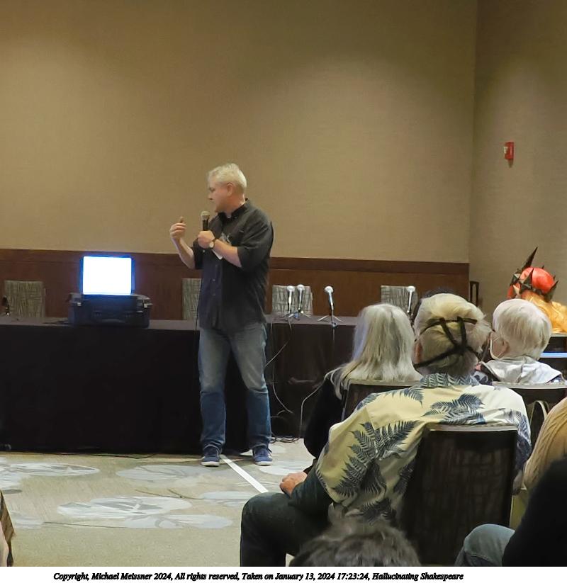 Picture #22: Hallucinating Shakespeare #2 Thumb: 480x480, 48,790 bytes (48K) Small: 800x823, 85,683 bytes (84K), (html file) Large: 2400x2400, 1,914,370 bytes (1.8M), (html file) Copyright, Michael Meissner 2024, All rights reserved OM OM1 camera with Olympus-m43 12-40mm f/2.8 lens f/2.8, ISO 3200, 1/125 sec, 12.0mm, auto mode, vivid color, matrix metering, digital zoom x2, continous focus, IS Auto, anti-shock 35mm equivalent focal length 48.0mm, digital zoom x2 Programs used: crop, gimp, raw therapee Taken by Michael Meissner on January 13, 2024 17:23:24 Last modified on January 21, 2024 at 01:23 |
