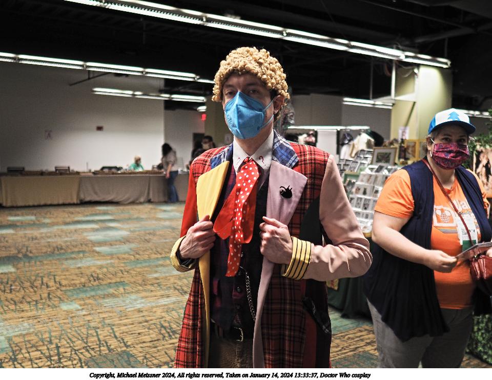 Picture #32: Doctor Who cosplay Thumb: 480x360, 57,490 bytes (57K) Small: 960x743, 141,168 bytes (138K), (html file) Large: 4800x3600, 3,402,908 bytes (3.2M), (html file) Copyright, Michael Meissner 2024, All rights reserved Olympus E-M1-II camera with Sigma 16mm f/1.4 lens f/1.4, ISO 200, flash, 1/60 sec, 16.0mm, auto mode, natural color, SHQ, center weight metering, continous focus, IS Auto, both eyes priority, face detection, anti-shock 35mm equivalent focal length 32.0mm Programs used: crop, raw therapee Taken by Michael Meissner on January 14, 2024 13:33:37 Last modified on January 22, 2024 at 01:20 |