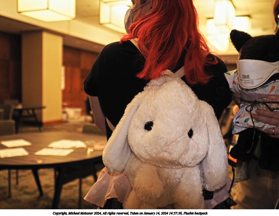 Picture #43: Plushie backpack #2 Thumb: 480x360, 45,008 bytes (44K) Small: 960x743, 94,006 bytes (92K), (html file) Large: 4800x3600, 2,305,231 bytes (2.2M), (html file) Copyright, Michael Meissner 2024, All rights reserved Olympus E-M1-II camera with Sigma 16mm f/1.4 lens f/1.4, ISO 250, flash, 1/60 sec, 16.0mm, auto mode, natural color, SHQ, center weight metering, continous focus, IS Auto, both eyes priority, face detection, anti-shock 35mm equivalent focal length 32.0mm Programs used: crop, raw therapee Taken by Michael Meissner on January 14, 2024 14:57:59 Last modified on January 22, 2024 at 01:26 |