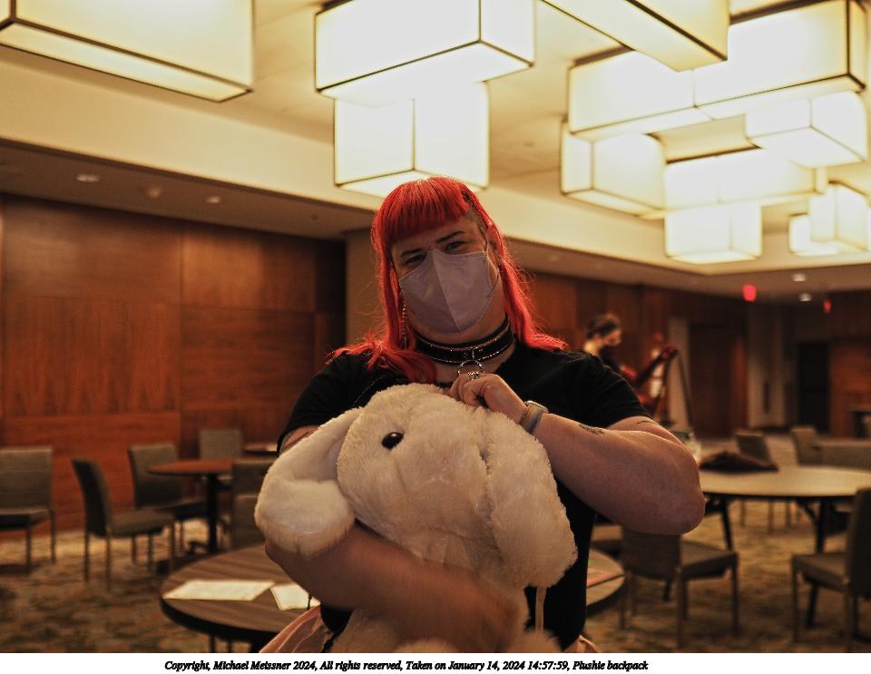 Picture #42: Plushie backpack Thumb: 480x360, 47,422 bytes (47K) Small: 960x743, 108,014 bytes (106K), (html file) Large: 4800x3600, 2,787,513 bytes (2.7M), (html file) Copyright, Michael Meissner 2024, All rights reserved Olympus E-M1-II camera with Sigma 16mm f/1.4 lens f/1.4, ISO 200, flash, 1/60 sec, 16.0mm, auto mode, natural color, SHQ, center weight metering, continous focus, IS Auto, both eyes priority, face detection, anti-shock 35mm equivalent focal length 32.0mm Programs used: crop, raw therapee Taken by Michael Meissner on January 14, 2024 14:57:36 Last modified on January 22, 2024 at 01:26 |
