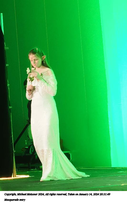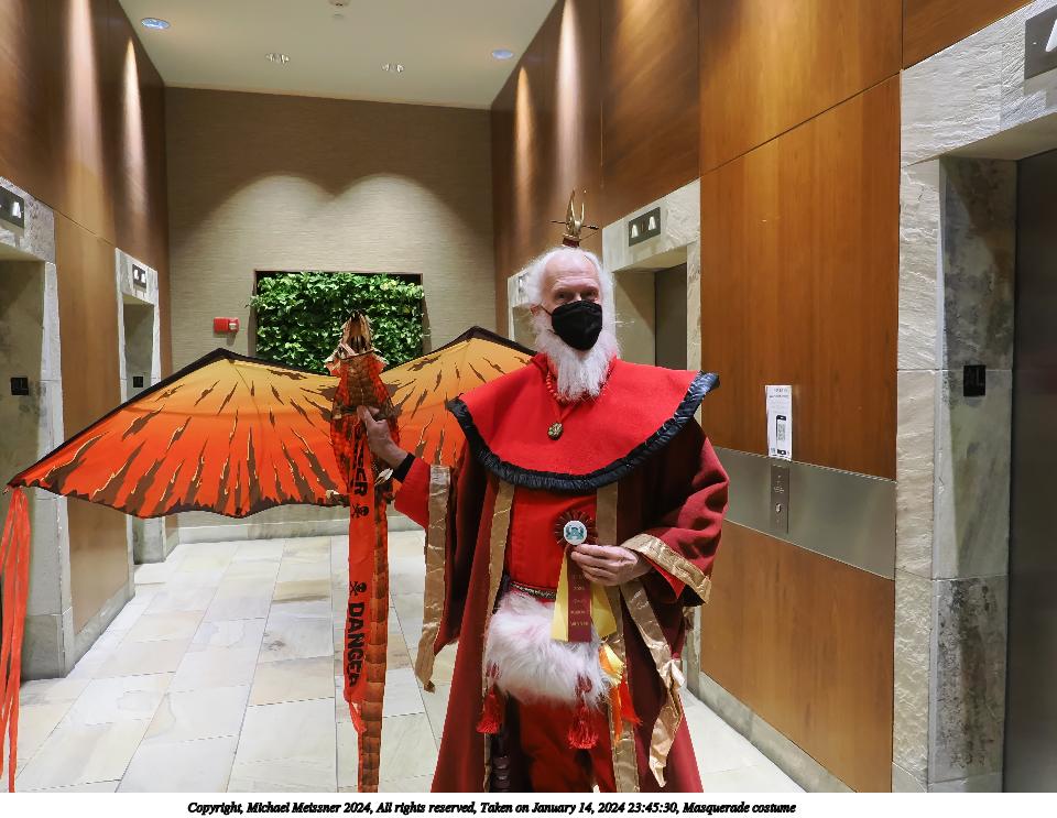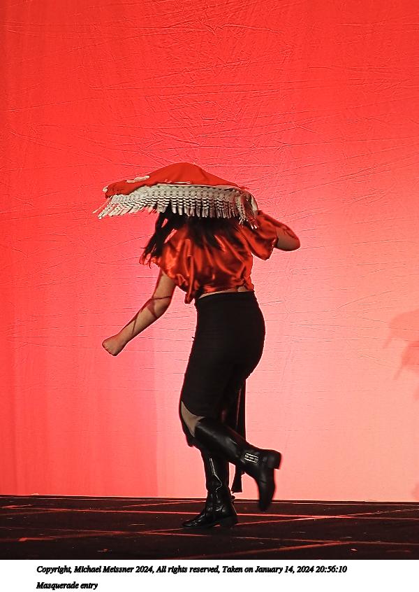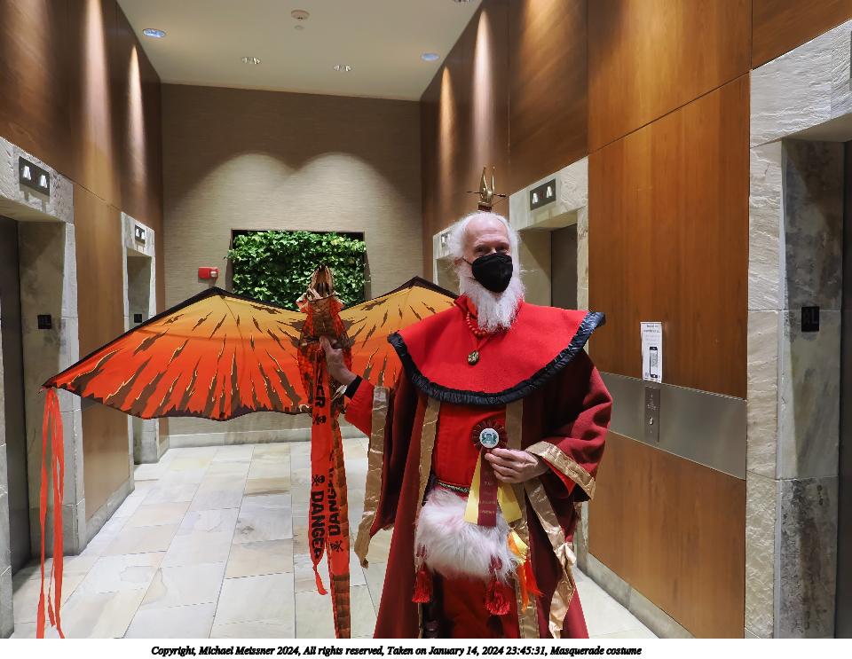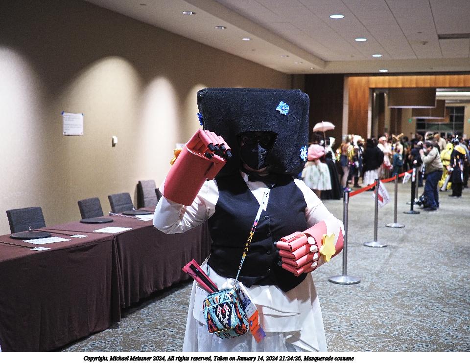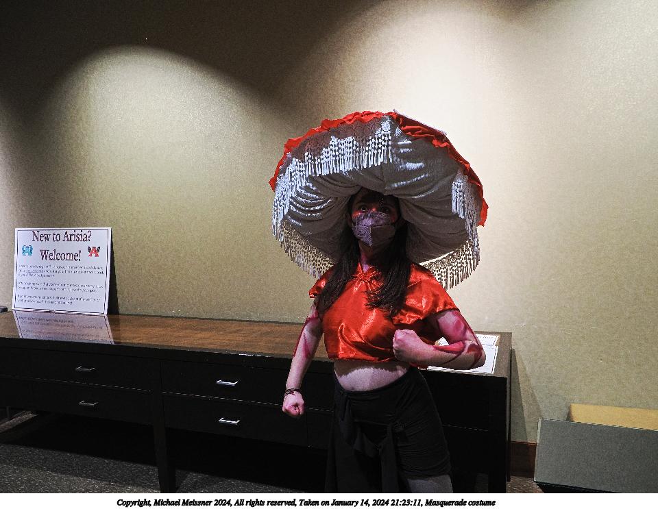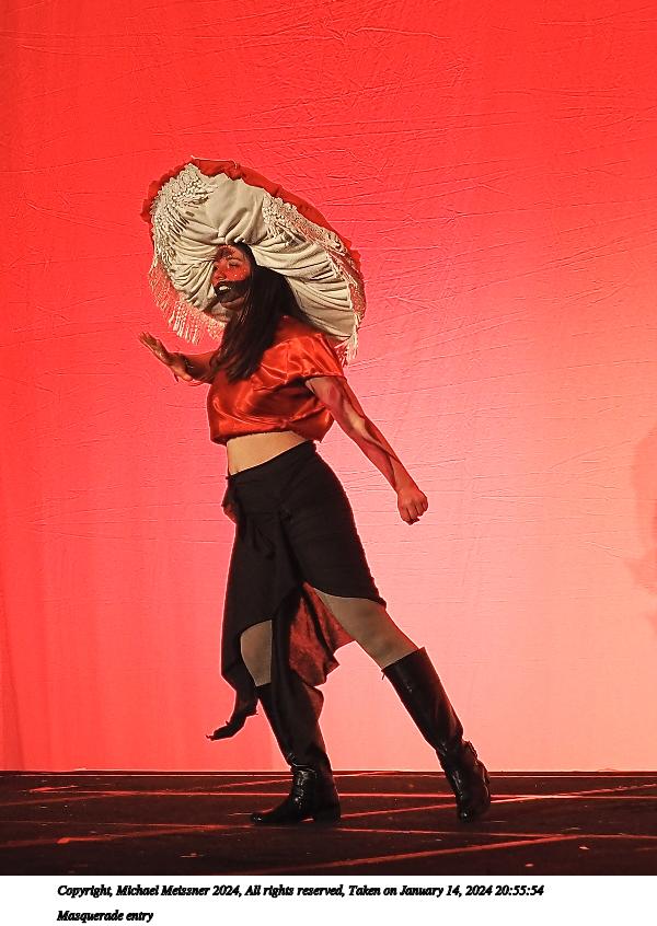 Picture #72: Masquerade entry #24 Thumb: 272x400, 35,797 bytes (35K) Small: 543x846, 82,368 bytes (81K), (html file) Large: 2000x2944, 3,572,800 bytes (3.4M), (html file) Copyright, Michael Meissner 2024, All rights reserved OM OM1 camera with Olympus-m43 12-40mm f/2.8 lens f/2.8, ISO 250, 1/125 sec, 31.0mm, auto mode, vivid color, center weight metering, continous focus, IS Auto, face detection, anti-shock 35mm equivalent focal length 62.0mm Programs used: crop, gimp, raw therapee Taken by Michael Meissner on January 14, 2024 20:51:17 Last modified on January 30, 2024 at 23:30 |