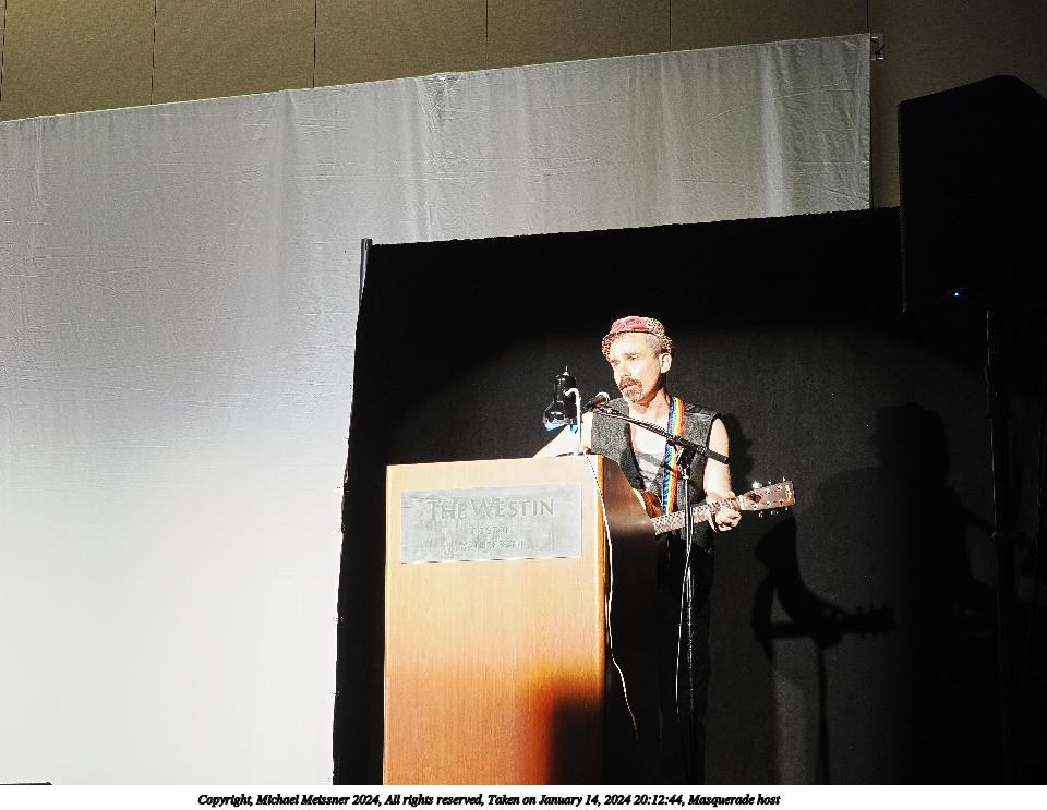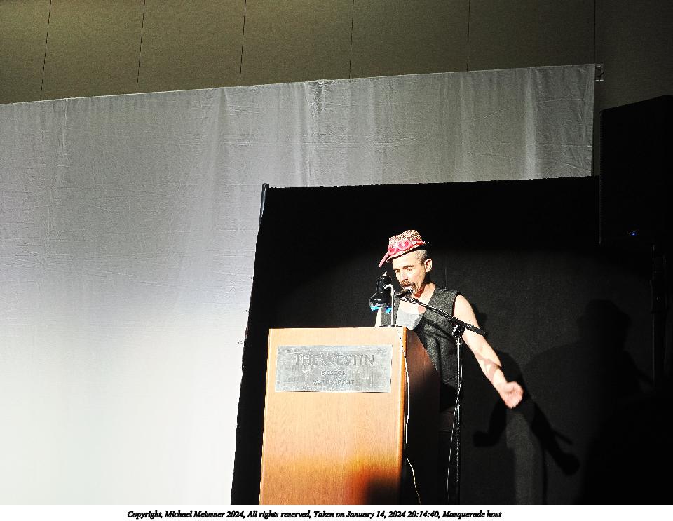 Picture #1: Masquerade host Thumb: 480x360, 38,493 bytes (38K) Small: 960x743, 98,767 bytes (97K), (html file) Large: 4800x3600, 3,240,426 bytes (3.1M), (html file) Copyright, Michael Meissner 2024, All rights reserved OM OM1 camera with Olympus-m43 12-40mm f/2.8 lens f/2.8, ISO 1000, 1/125 sec, 25.0mm, auto mode, vivid color, center weight metering, bias -0.3, continous focus, IS Auto, face detection, anti-shock 35mm equivalent focal length 50.0mm Programs used: crop, raw therapee Taken by Michael Meissner on January 14, 2024 20:12:44 Last modified on January 28, 2024 at 02:43 |
