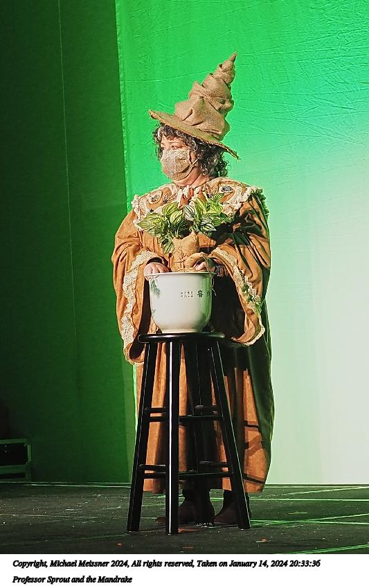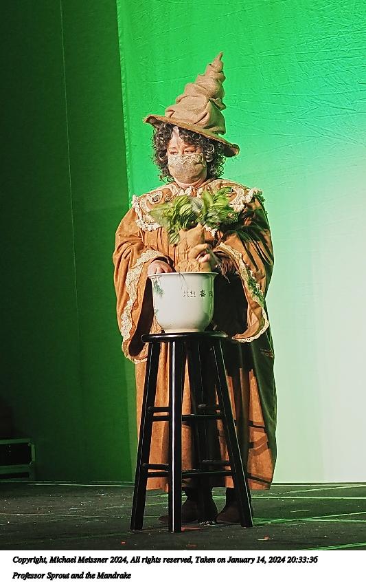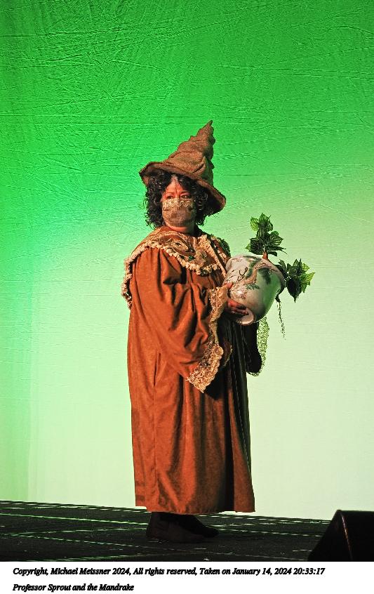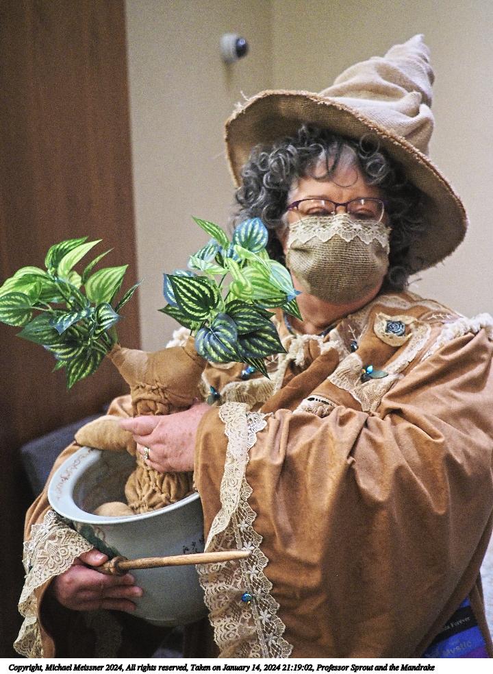 Picture #115: Professor Sprout and the Mandrake #5 Thumb: 360x480, 55,162 bytes (54K) Small: 720x983, 161,630 bytes (158K), (html file) Large: 3600x4800, 5,415,675 bytes (5.2M), (html file) Copyright, Michael Meissner 2024, All rights reserved Olympus E-M5-III camera with Panasonic 20mm f/1.7 lens f/1.8, ISO 1600, 1/60 sec, 20.0mm, auto mode, vivid color, SHQ, center weight metering, bias -0.3, IS Auto, face detection, anti-shock 35mm equivalent focal length 40.0mm Programs used: crop, raw therapee, rotate left Taken by Michael Meissner on January 14, 2024 21:19:02 Last modified on January 30, 2024 at 23:58 |