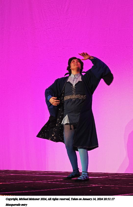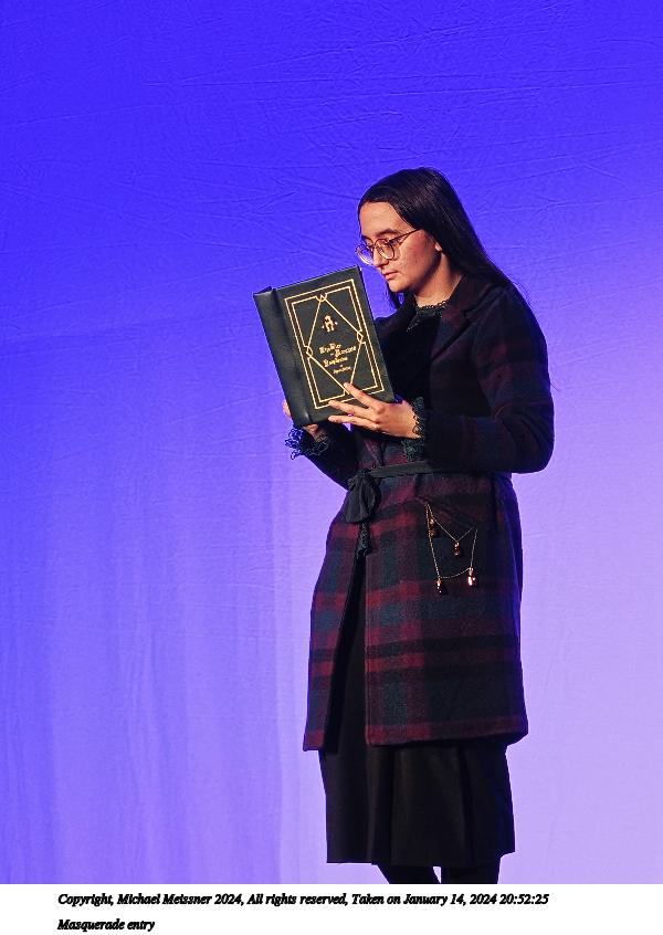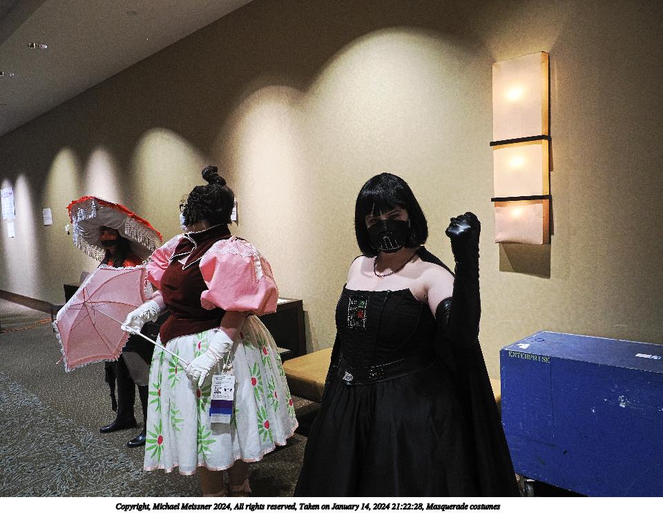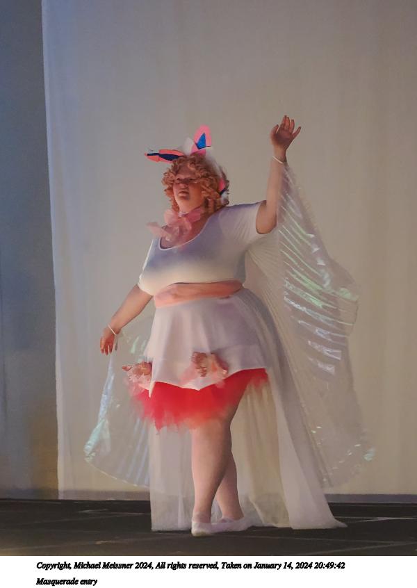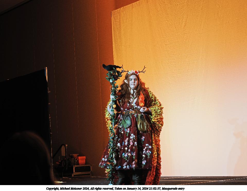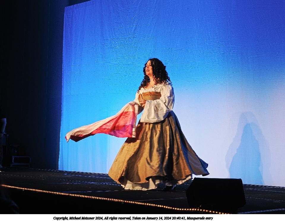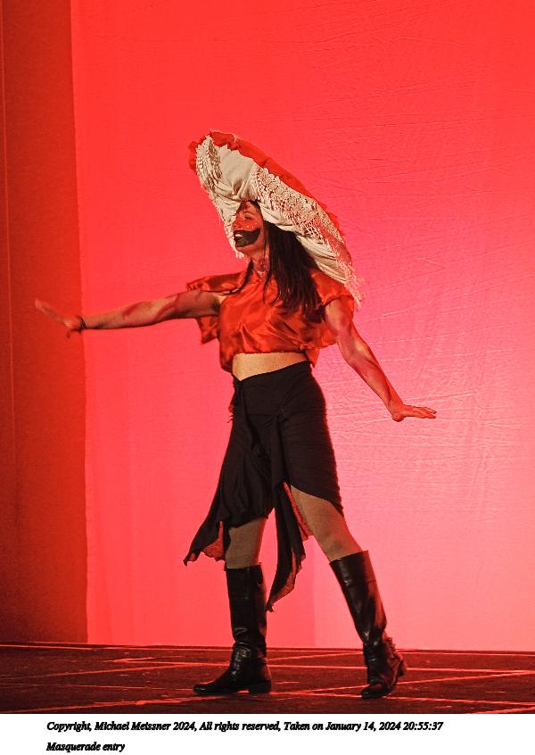 Picture #90: Masquerade entry #42 Thumb: 267x400, 40,789 bytes (40K) Small: 600x946, 121,285 bytes (119K), (html file) Large: 2400x3600, 2,183,634 bytes (2.1M), (html file) Copyright, Michael Meissner 2024, All rights reserved OM OM1 camera with Olympus-m43 12-40mm f/2.8 lens f/2.8, ISO 500, 1/125 sec, 35.0mm, auto mode, vivid color, center weight metering, continous focus, IS Auto, face detection, anti-shock 35mm equivalent focal length 70.0mm Programs used: crop, raw therapee Taken by Michael Meissner on January 14, 2024 20:57:47 Last modified on January 30, 2024 at 23:43 |