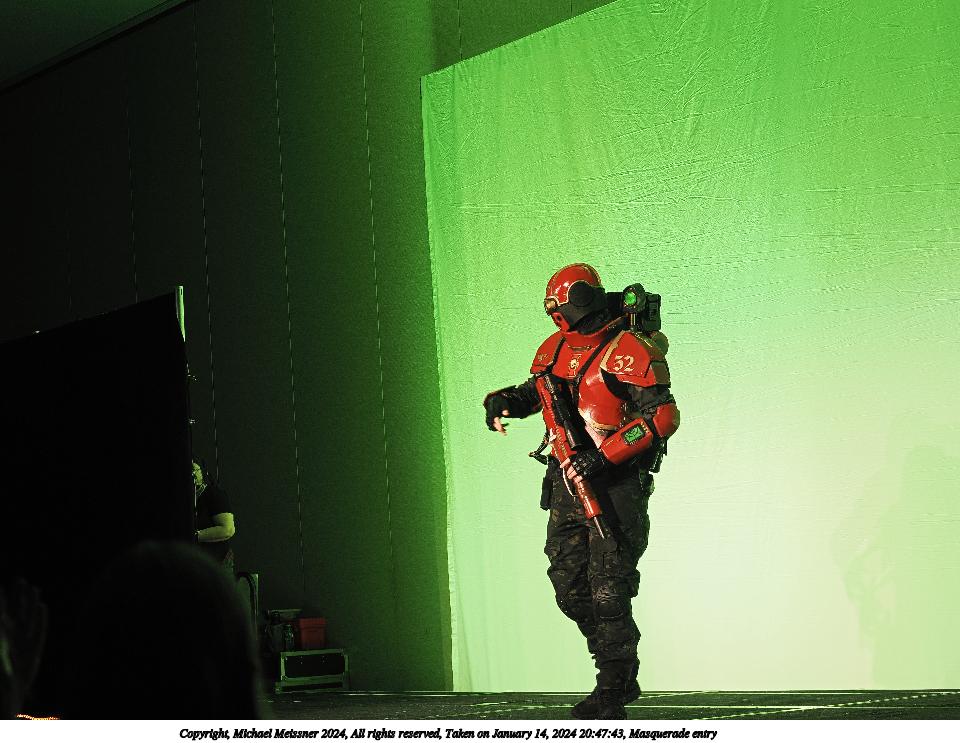 Picture #104: Masquerade entry #52 Thumb: 480x360, 47,881 bytes (47K) Small: 960x743, 142,999 bytes (140K), (html file) Large: 4800x3600, 4,187,067 bytes (4.0M), (html file) Copyright, Michael Meissner 2024, All rights reserved OM OM1 camera with Olympus-m43 12-40mm f/2.8 lens f/2.8, ISO 250, 1/125 sec, 34.0mm, auto mode, vivid color, center weight metering, continous focus, IS Auto, face detection, anti-shock 35mm equivalent focal length 68.0mm Programs used: crop, raw therapee Taken by Michael Meissner on January 14, 2024 21:02:40 Last modified on January 30, 2024 at 23:49 |