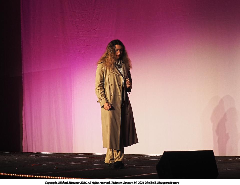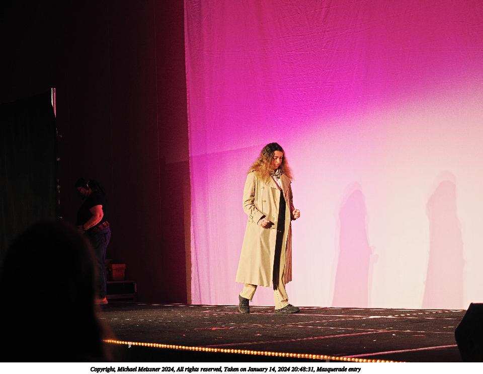 Picture #105: Masquerade entry #53 Thumb: 480x360, 43,179 bytes (43K) Small: 960x743, 133,877 bytes (131K), (html file) Large: 4800x3600, 4,006,216 bytes (3.8M), (html file) Copyright, Michael Meissner 2024, All rights reserved OM OM1 camera with Olympus-m43 12-40mm f/2.8 lens f/2.8, ISO 200, 1/125 sec, 32.0mm, auto mode, vivid color, center weight metering, continous focus, IS Auto, face detection, anti-shock 35mm equivalent focal length 64.0mm Programs used: crop, raw therapee Taken by Michael Meissner on January 14, 2024 21:02:57 Last modified on January 30, 2024 at 23:49 |