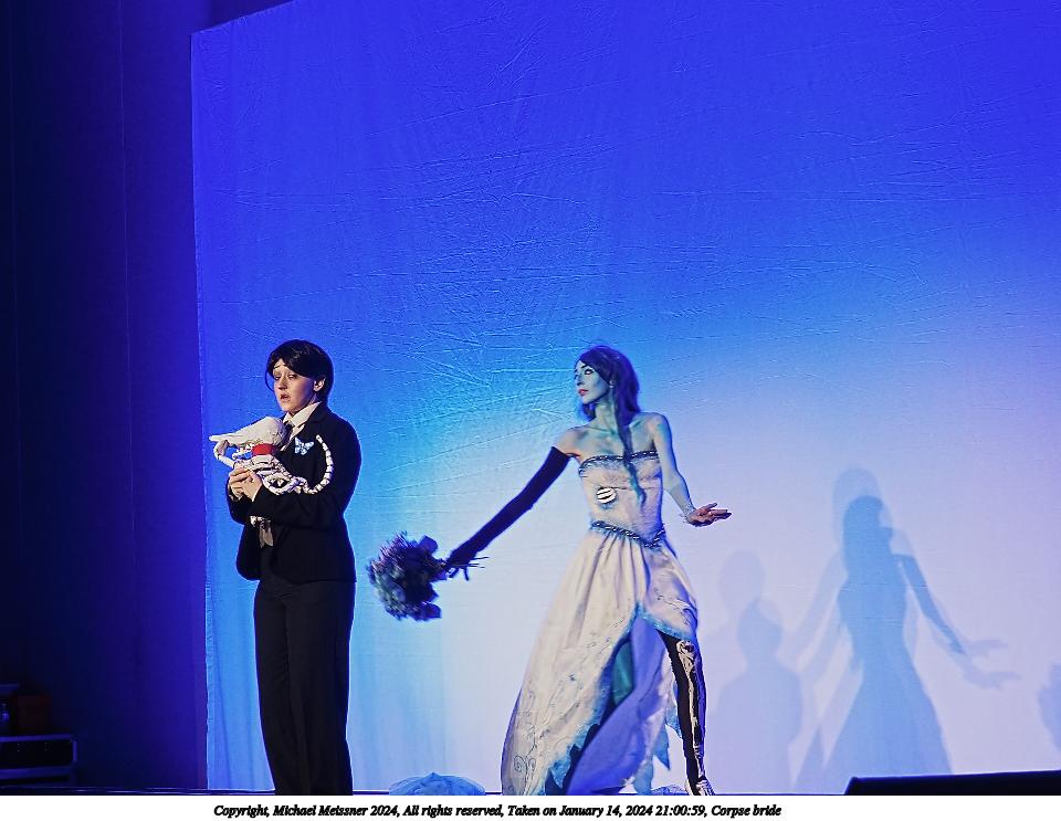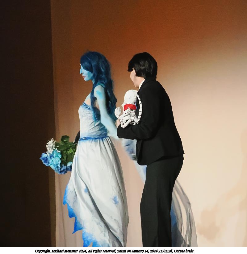 Picture #97: Corpse bride Thumb: 480x360, 36,960 bytes (37K) Small: 960x743, 83,888 bytes (82K), (html file) Large: 4800x3600, 2,008,657 bytes (1.9M), (html file) Copyright, Michael Meissner 2024, All rights reserved Olympus E-M5-III camera with Panasonic 20mm f/1.7 lens f/2.0, ISO 200, 1/100 sec, 20.0mm, auto mode, vivid color, SHQ, center weight metering, bias -0.3, digital zoom x2, IS Auto, face detection, anti-shock 35mm equivalent focal length 80.0mm, digital zoom x2 Programs used: crop, raw therapee Taken by Michael Meissner on January 14, 2024 21:00:58 Last modified on January 30, 2024 at 23:46 |