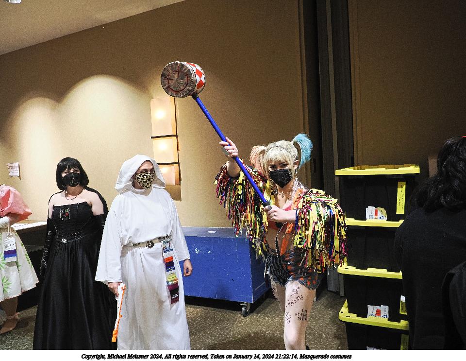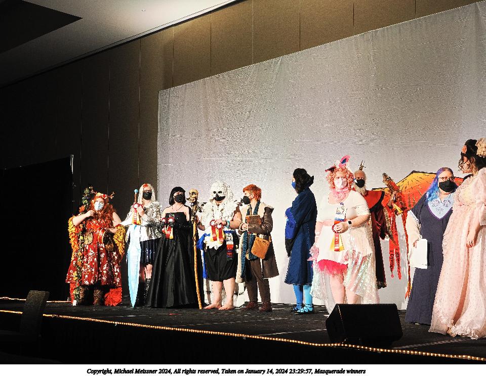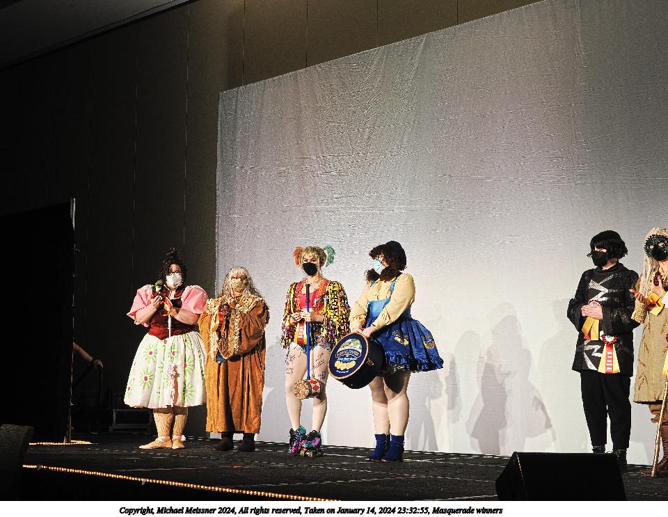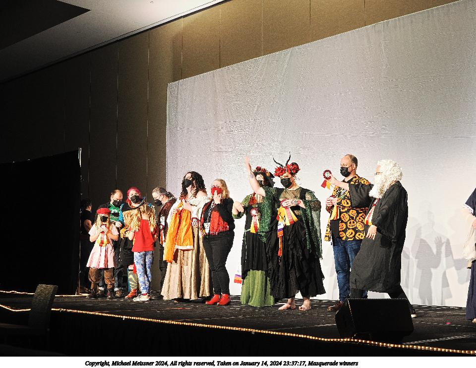 Picture #136: Masquerade winners #6 Thumb: 480x360, 54,335 bytes (54K) Small: 960x743, 170,864 bytes (167K), (html file) Large: 4800x3600, 4,817,778 bytes (4.6M), (html file) Copyright, Michael Meissner 2024, All rights reserved OM OM1 camera with Olympus-m43 12-40mm f/2.8 lens f/2.8, ISO 800, 1/125 sec, 21.0mm, auto mode, vivid color, center weight metering, continous focus, IS Auto, face detection, anti-shock 35mm equivalent focal length 42.0mm Programs used: crop, raw therapee Taken by Michael Meissner on January 14, 2024 23:37:35 Last modified on January 31, 2024 at 00:04 |