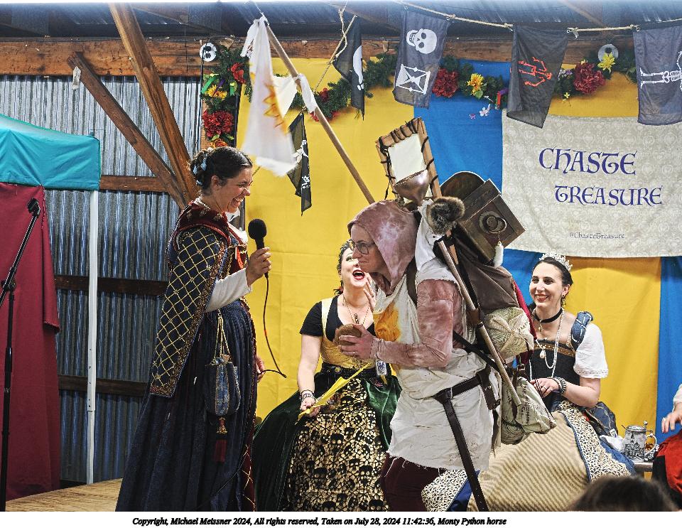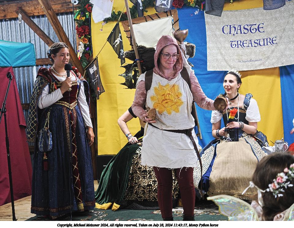 Picture #19: Monty Python horse Small: 960x743, 197,784 bytes (194K), (html file) Large: 4800x3600, 5,187,528 bytes (4.9M), (html file) Copyright, Michael Meissner 2024, All rights reserved OM OM1 camera with Olympus-m43 12-40mm f/2.8 lens f/2.8, ISO 400, flash, 1/80 sec, 38.0mm, auto mode, vivid color, matrix metering, continous focus, IS Auto, face detection, anti-shock 35mm equivalent focal length 76.0mm Programs used: crop, raw therapee Taken by Michael Meissner on July 28, 2024 11:42:32 Last modified on September 11, 2024 at 02:24 |