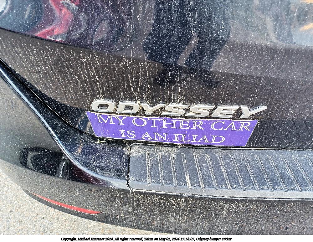 Picture #51: Odyssey bumper sticker 1000x773, 278,127 bytes (272K), (html file) Copyright, Michael Meissner 2024, All rights reserved Samsung A32 5G phone f/1.8, ISO 160, 1/60 sec, 4.6mm, auto mode, center weight metering 35mm equivalent focal length 25.0mm Programs used: raw therapee Taken by Michael Meissner on May 02, 2024 17:58:07 Last modified on May 04, 2024 at 20:45 |