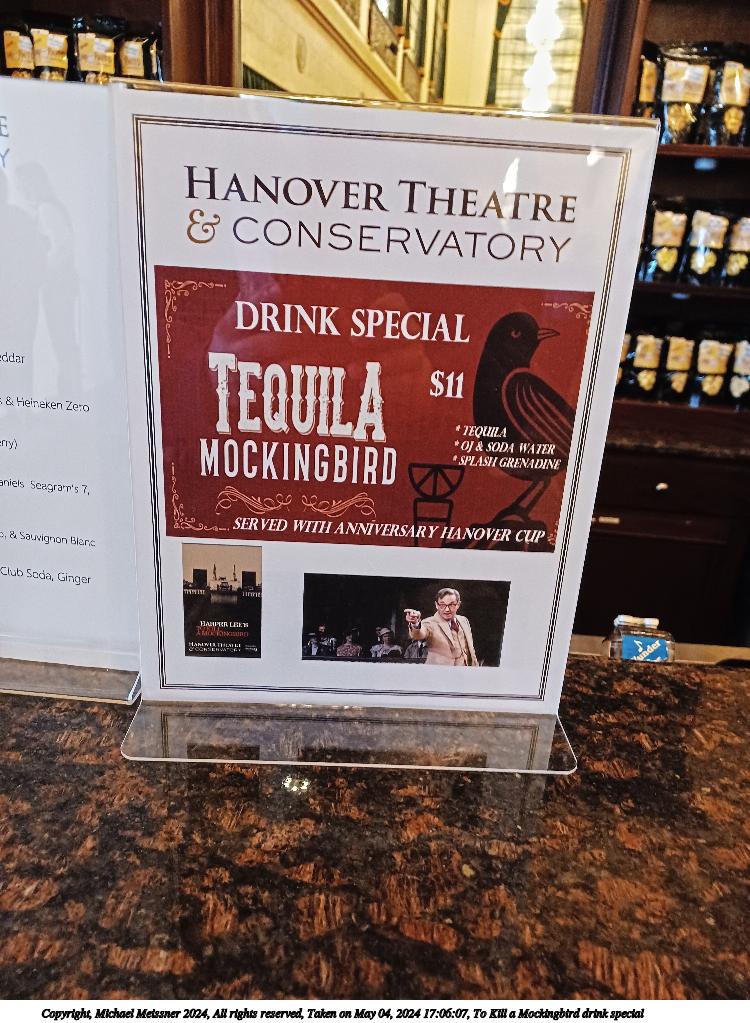 Picture #50: To Kill a Mockingbird drink special 750x1023, 156,030 bytes (153K), (html file) Copyright, Michael Meissner 2024, All rights reserved Samsung A32 5G phone f/1.8, ISO 1250, 1/20 sec, 4.6mm, auto mode, center weight metering 35mm equivalent focal length 25.0mm Programs used: raw therapee, rotate right Taken by Michael Meissner on May 04, 2024 17:06:07 Last modified on June 01, 2024 at 21:33 |