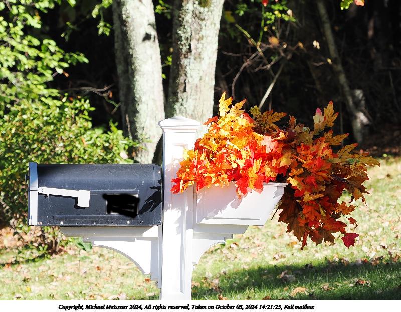 Picture #84: Fall mailbox 800x623, 141,373 bytes (139K), (html file) Copyright, Michael Meissner 2024, All rights reserved OM OM1 camera with Olympus-m43 40-150mm f/2.8 lens f/4.5, ISO 200, 1/500 sec, 110.0mm, auto mode, vivid color, matrix metering, continous focus, IS Auto 35mm equivalent focal length 220.0mm Programs used: crop, gimp, raw therapee Taken by Michael Meissner on October 05, 2024 14:21:25 Last modified on October 06, 2024 at 16:07 This picture is one of my favorites. |