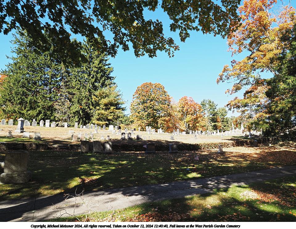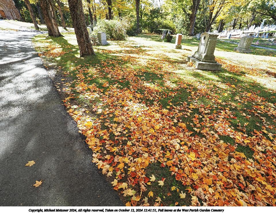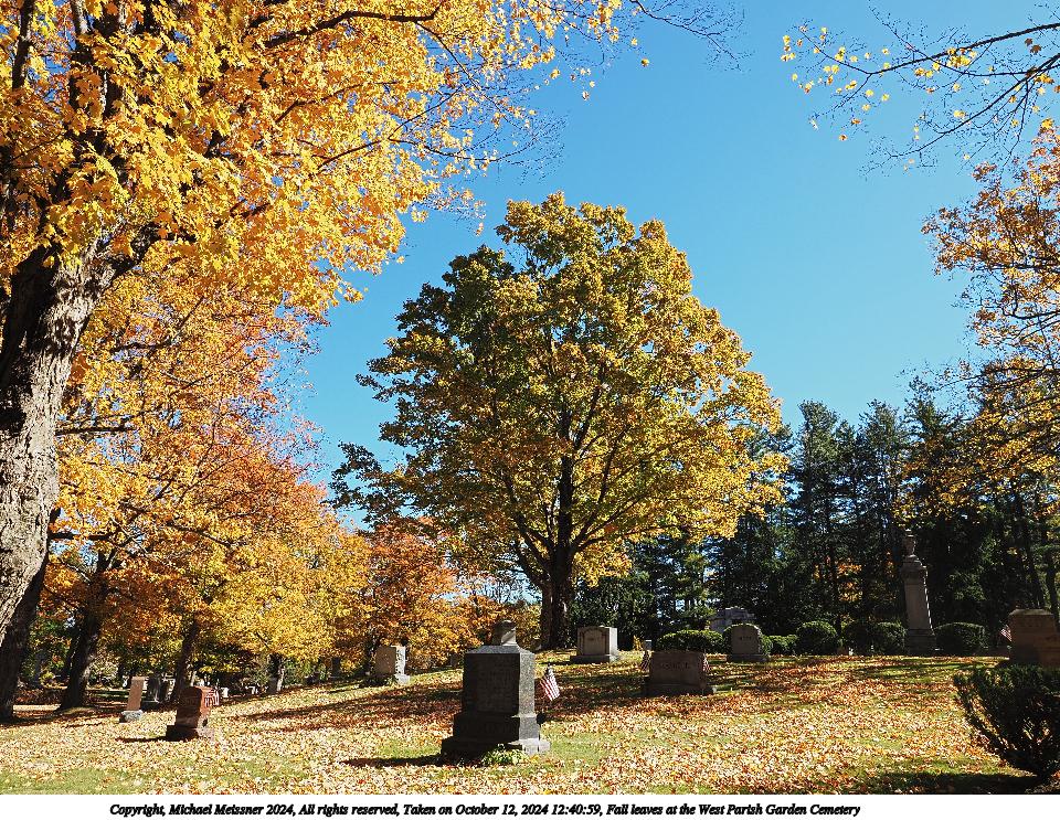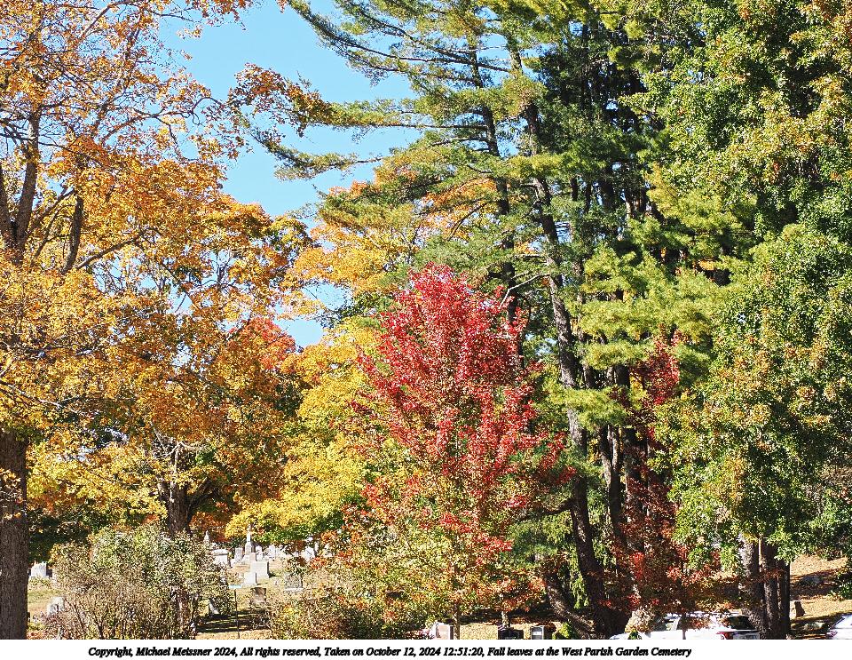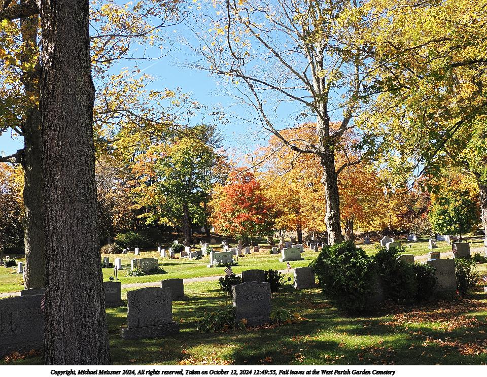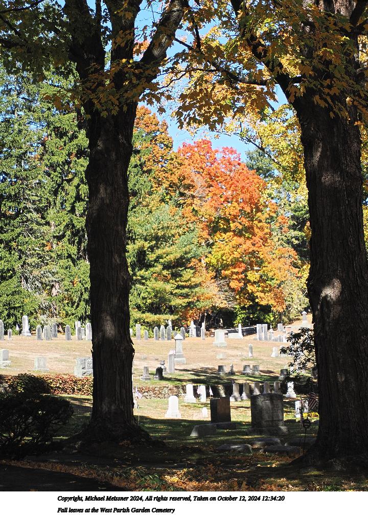 Picture #47: Fall leaves at the West Parish Garden Cemetery #19 960x743, 346,190 bytes (339K), (html file) Copyright, Michael Meissner 2024, All rights reserved Olympus E-M5-III camera with Olympus-m43 7-14mm f/2.8 lens f/4.0, ISO 200, 1/125 sec, 7.0mm, auto mode, vivid color, SHQ, matrix metering, bias 0.3, IS Auto, anti-shock 35mm equivalent focal length 14.0mm Programs used: crop, raw therapee Taken by Michael Meissner on October 12, 2024 12:41:51 Last modified on October 13, 2024 at 16:35 This picture is one of my favorites. |
