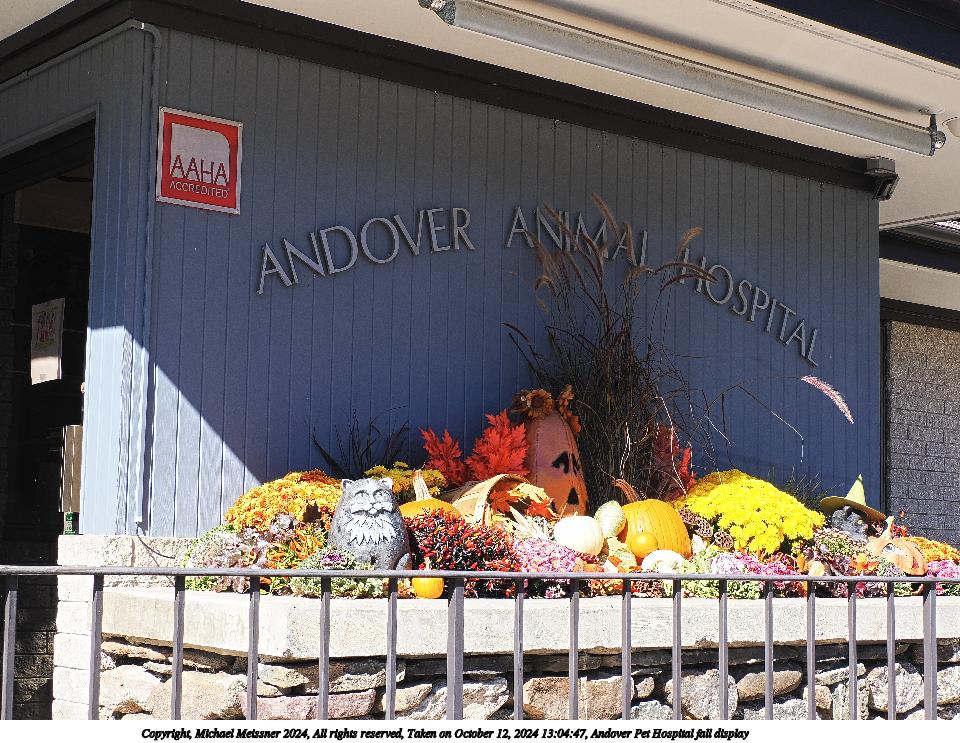 Picture #28: Andover Pet Hospital fall display 960x743, 191,673 bytes (188K), (html file) Copyright, Michael Meissner 2024, All rights reserved OM OM1 camera with Olympus-m43 12-200mm f/3.5-6.3 lens f/9.0, ISO 200, 1/200 sec, 28.0mm, auto mode, vivid color, matrix metering, continous focus, IS Auto, anti-shock 35mm equivalent focal length 56.0mm Programs used: adjusttime, crop, raw therapee Taken by Michael Meissner on October 12, 2024 13:04:47 Last modified on October 13, 2024 at 16:47 |