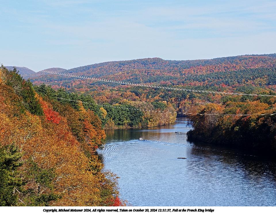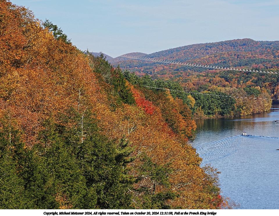 Picture #23: Fall at the French King bridge 960x743, 221,330 bytes (217K), (html file) Copyright, Michael Meissner 2024, All rights reserved OM OM1 camera with Olympus-m43 12-200mm f/3.5-6.3 lens f/9.0, ISO 200, 1/250 sec, 34.0mm, auto mode, vivid color, matrix metering, continous focus, IS Auto, anti-shock 35mm equivalent focal length 68.0mm Programs used: crop, gimp, raw therapee Taken by Michael Meissner on October 20, 2024 12:30:42 Last modified on October 26, 2024 at 20:58 |