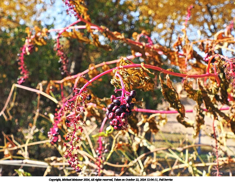 Picture #6: Fall berries 960x743, 148,829 bytes (146K), (html file) Copyright, Michael Meissner 2024, All rights reserved OM OM1 camera with Olympus-m43 12-200mm f/3.5-6.3 lens f/9.0, ISO 200, 1/250 sec, 56.0mm, auto mode, vivid color, matrix metering, continous focus, IS Auto, anti-shock 35mm equivalent focal length 112.0mm Programs used: crop, raw therapee Taken by Michael Meissner on October 22, 2024 12:03:57 Last modified on October 26, 2024 at 21:31 This picture is one of my favorites. |