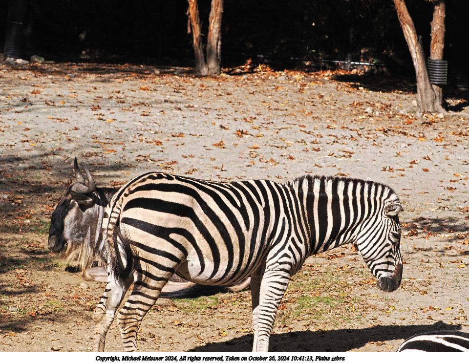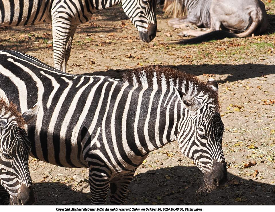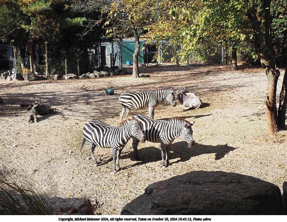 Picture #3: Plains zebra #3 Thumb: 480x360, 80,566 bytes (79K) Small: 960x743, 314,621 bytes (308K), (html file) Copyright, Michael Meissner 2024, All rights reserved Olympus E-M5-III camera with Olympus-m43 12-200mm f/3.5-6.3 lens f/9.0, ISO 200, 1/250 sec, 23.0mm, auto mode, vivid color, SHQ, matrix metering, bias 0.3, IS Auto, anti-shock 35mm equivalent focal length 46.0mm Programs used: crop, raw therapee Taken by Michael Meissner on October 26, 2024 10:43:12 Last modified on October 29, 2024 at 02:16 |