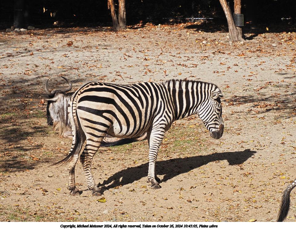 Picture #4: Plains zebra #4 Thumb: 480x360, 72,859 bytes (72K) Small: 960x743, 269,262 bytes (263K), (html file) Copyright, Michael Meissner 2024, All rights reserved Olympus E-M5-III camera with Olympus-m43 12-200mm f/3.5-6.3 lens f/9.0, ISO 200, 1/320 sec, 80.0mm, auto mode, vivid color, SHQ, matrix metering, bias 0.3, IS Auto 35mm equivalent focal length 160.0mm Programs used: crop, raw therapee Taken by Michael Meissner on October 26, 2024 10:44:20 Last modified on October 29, 2024 at 02:17 |