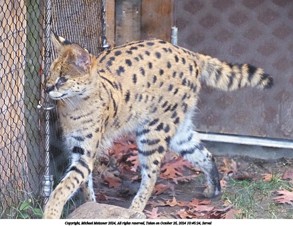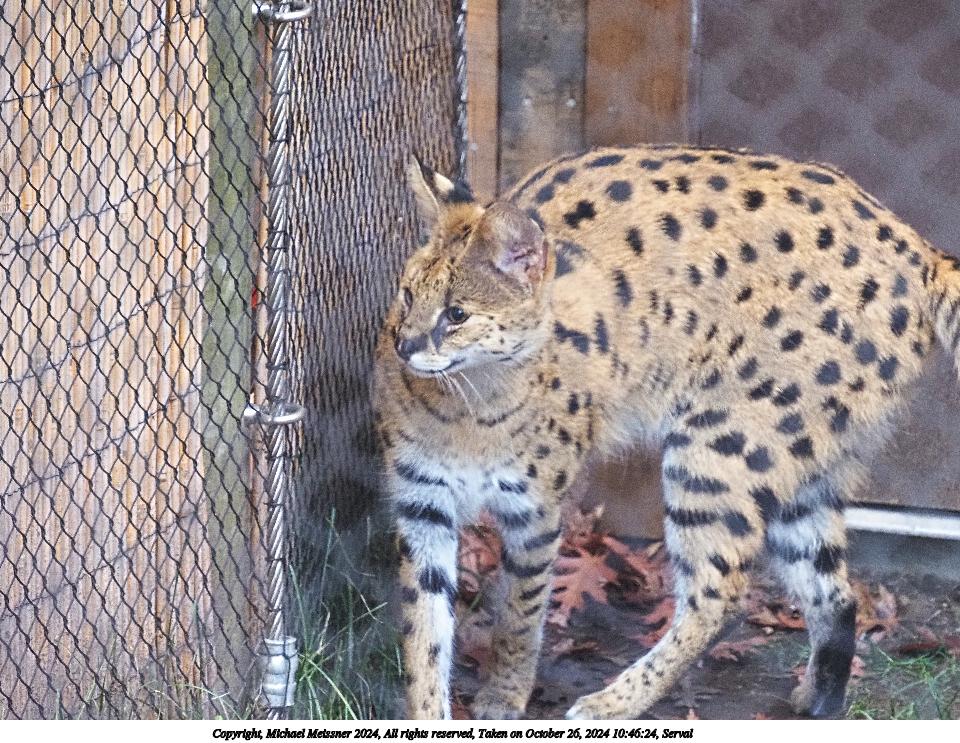 Picture #1: Serval Thumb: 480x360, 71,035 bytes (70K) Small: 960x743, 204,702 bytes (200K), (html file) Copyright, Michael Meissner 2024, All rights reserved Olympus E-M5-III camera with Olympus-m43 12-200mm f/3.5-6.3 lens f/6.3, ISO 2500, 1/320 sec, 149.0mm, auto mode, vivid color, SHQ, matrix metering, bias 0.3, IS Auto 35mm equivalent focal length 299.0mm Programs used: crop, raw therapee Taken by Michael Meissner on October 26, 2024 10:46:24 Last modified on October 29, 2024 at 02:22 |