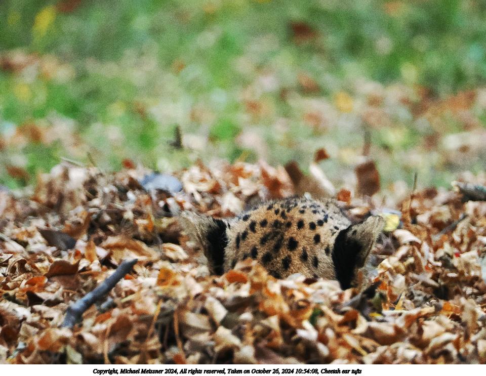 Picture #2: Cheetah ear tufts Thumb: 480x360, 57,387 bytes (57K) Small: 960x743, 159,409 bytes (156K), (html file) Copyright, Michael Meissner 2024, All rights reserved OM OM1 camera with Olympus-m43 100-400mm f/5.0-6.3 lens f/6.3, ISO 6400, 1/800 sec, 400.0mm, auto mode, vivid color, matrix metering, continous focus, IS Auto 35mm equivalent focal length 801.0mm Programs used: crop, raw therapee Taken by Michael Meissner on October 26, 2024 10:54:08 Last modified on October 29, 2024 at 02:35 This picture is one of my favorites. |