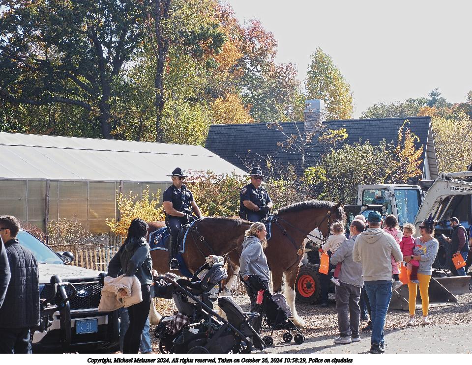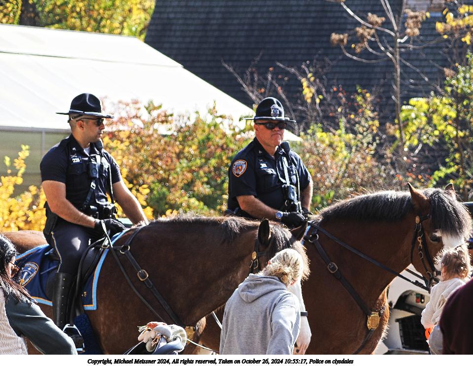 Picture #1: Police on clysdales Thumb: 480x360, 66,655 bytes (66K) Small: 960x743, 171,196 bytes (168K), (html file) Copyright, Michael Meissner 2024, All rights reserved OM OM1 camera with Olympus-m43 100-400mm f/5.0-6.3 lens f/5.6, ISO 200, 1/250 sec, 100.0mm, auto mode, vivid color, matrix metering, continous focus, IS Auto, anti-shock 35mm equivalent focal length 200.0mm Programs used: crop, raw therapee Taken by Michael Meissner on October 26, 2024 10:55:17 Last modified on October 29, 2024 at 02:36 |