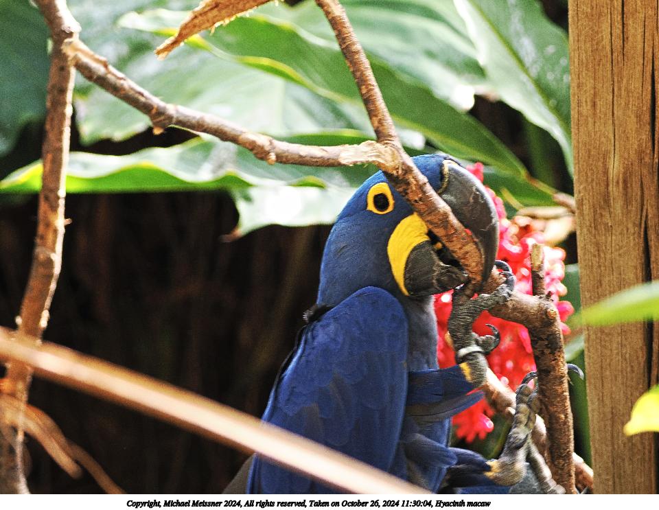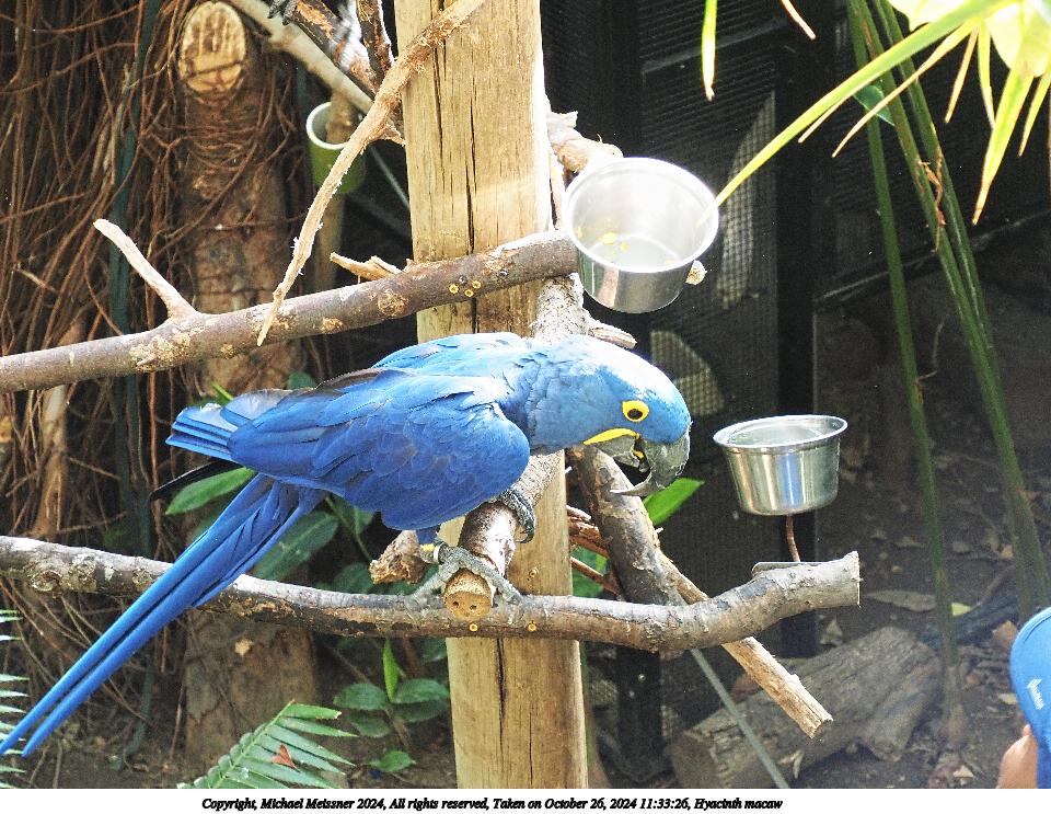 Picture #6: Hyacinth macaw #6 Thumb: 480x360, 66,988 bytes (66K) Small: 960x743, 177,563 bytes (174K), (html file) Copyright, Michael Meissner 2024, All rights reserved Olympus E-M5-III camera with Olympus-m43 12-200mm f/3.5-6.3 lens f/5.9, ISO 640, 1/125 sec, 63.0mm, auto mode, vivid color, SHQ, matrix metering, IS Auto, anti-shock 35mm equivalent focal length 126.0mm Programs used: crop, raw therapee Taken by Michael Meissner on October 26, 2024 11:32:46 Last modified on October 30, 2024 at 20:23 |