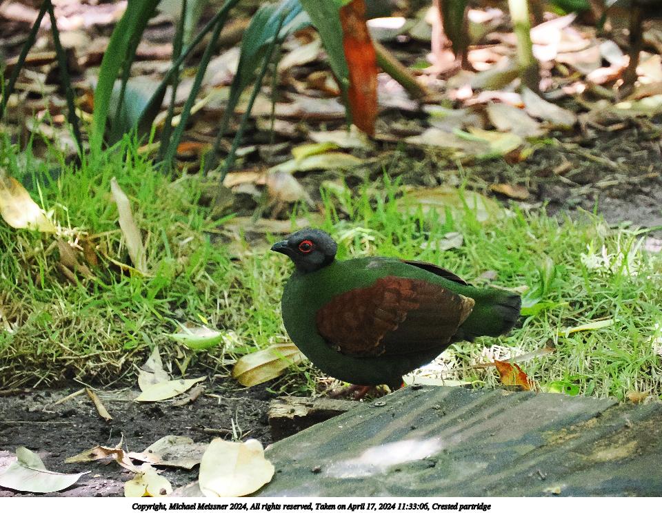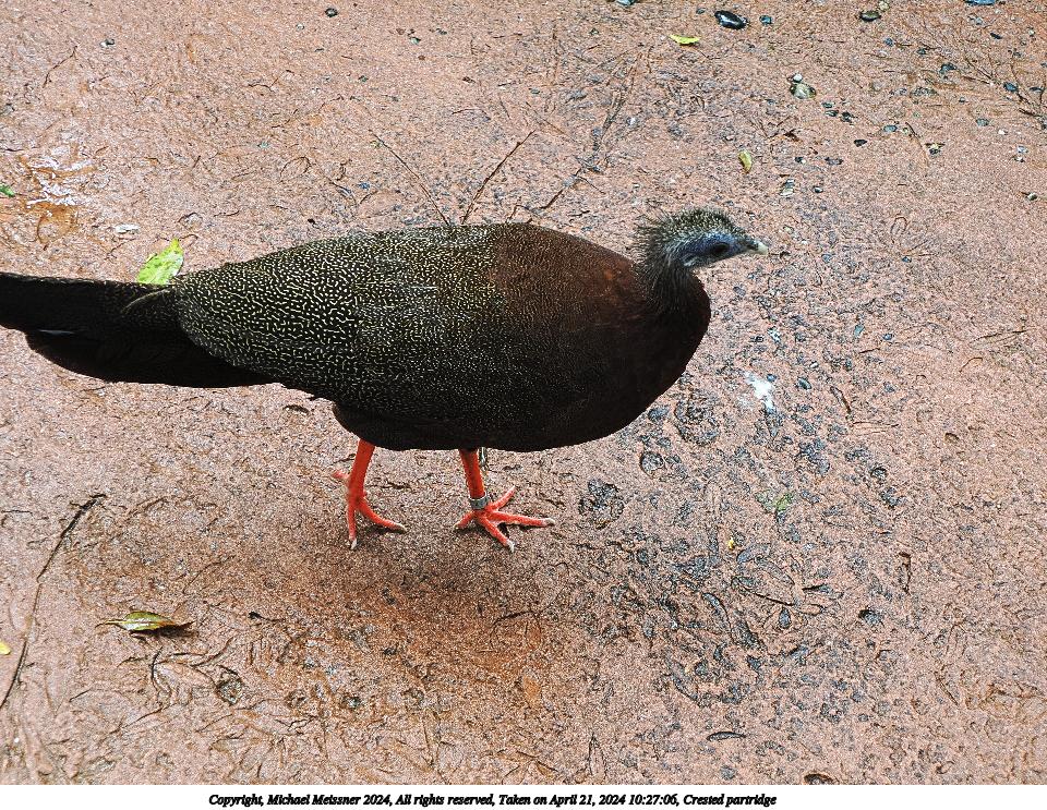 Picture #15: Crested partridge #2 Thumb: 480x360, 77,061 bytes (76K) Small: 960x743, 322,090 bytes (315K), (html file) Copyright, Michael Meissner 2024, All rights reserved OM OM1 camera with Olympus-m43 12-200mm f/3.5-6.3 lens f/5.0, ISO 800, 1/60 sec, 31.0mm, auto mode, vivid color, center weight metering, auto + manual focus, IS Auto, subject birds, anti-shock 35mm equivalent focal length 62.0mm Programs used: crop, raw therapee Taken by Michael Meissner on April 21, 2024 10:27:06 Last modified on May 12, 2024 at 18:37 |