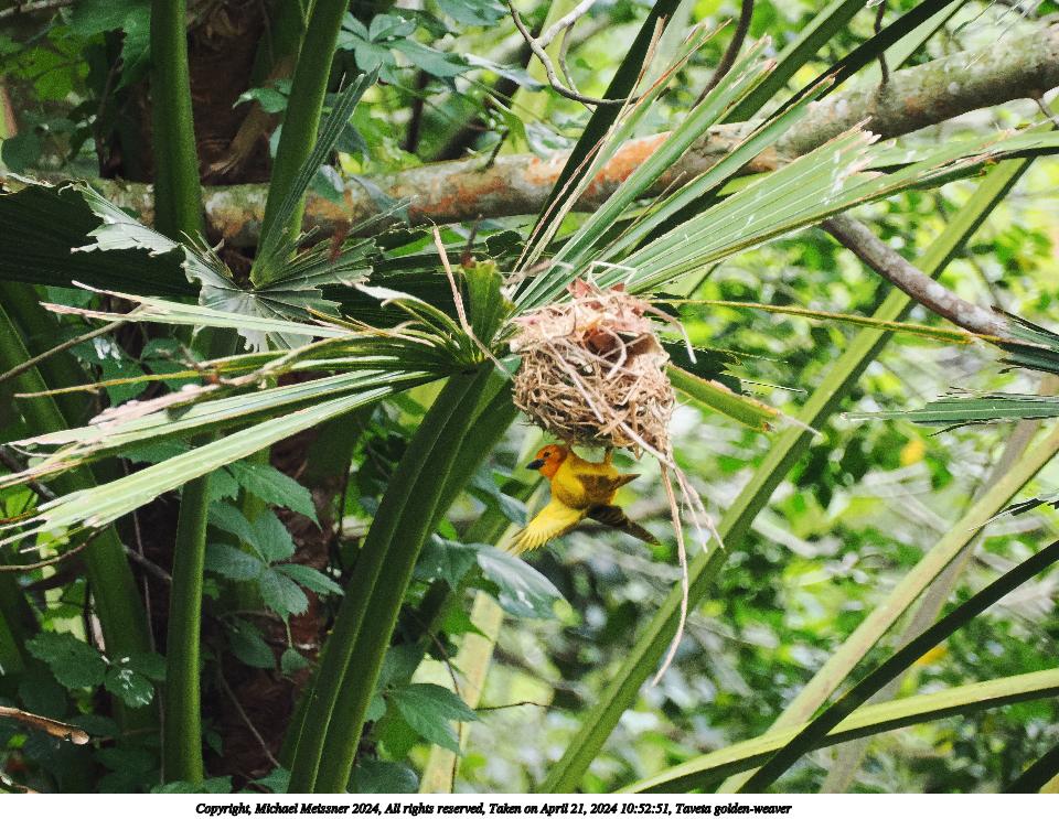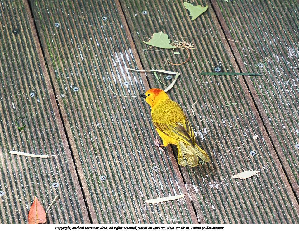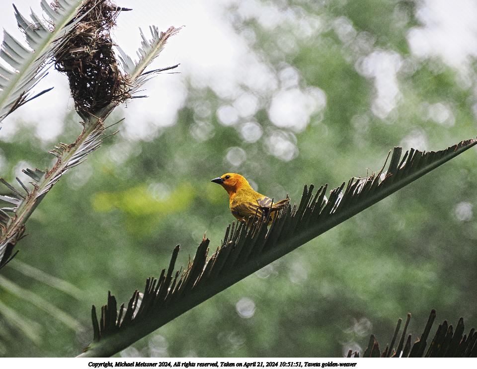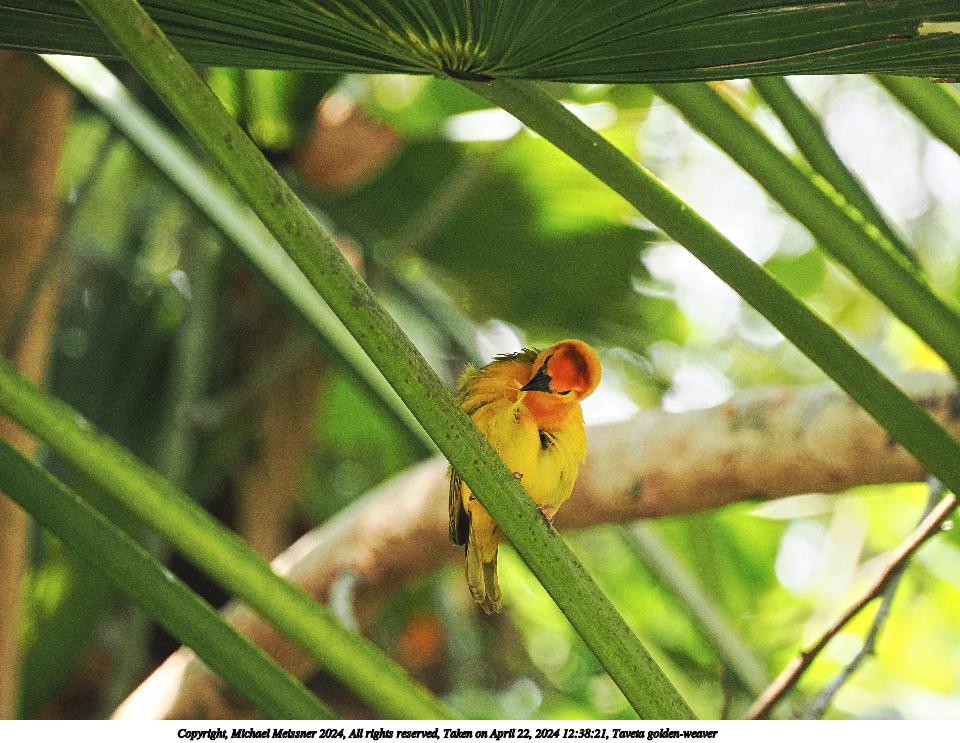Picture #30: Taveta golden-weaver #5 Thumb: 480x360, 86,823 bytes (85K) Small: 960x743, 302,616 bytes (296K), (html file) Copyright, Michael Meissner 2024, All rights reserved OM OM1 camera with Olympus-m43 12-200mm f/3.5-6.3 lens f/6.3, ISO 1000, 1/160 sec, 75.0mm, auto mode, vivid color, center weight metering, continous focus, IS Auto, subject birds, anti-shock 35mm equivalent focal length 150.0mm Programs used: crop, raw therapee Taken by Michael Meissner on April 22, 2024 12:38:39 Last modified on May 12, 2024 at 18:43 |