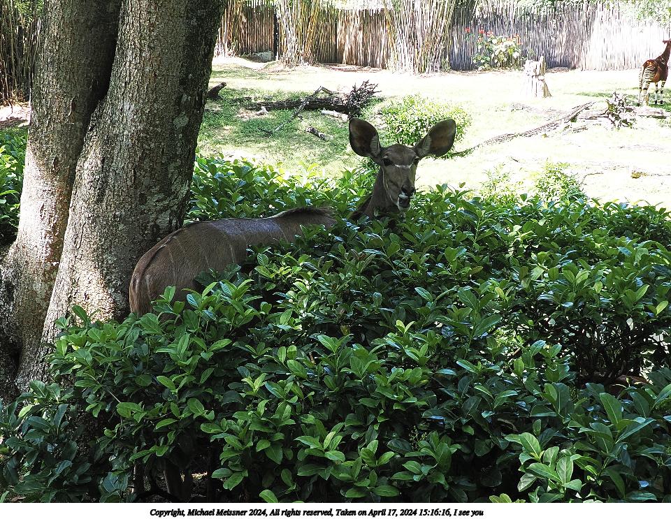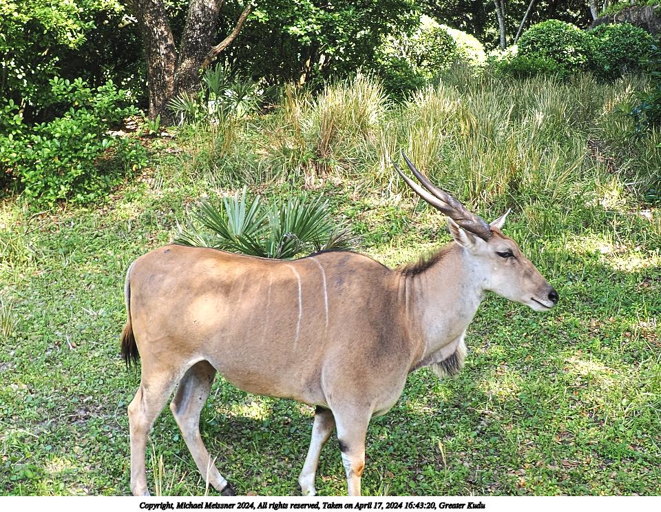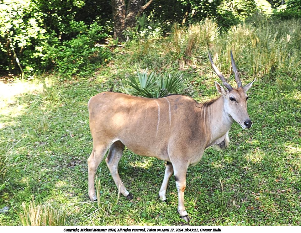 Picture #2: Greater Kudu #2 Thumb: 480x360, 86,452 bytes (85K) Small: 960x743, 260,456 bytes (255K), (html file) Copyright, Michael Meissner 2024, All rights reserved OM OM1 camera with Olympus-m43 12-200mm f/3.5-6.3 lens f/4.0, ISO 100, 1/80 sec, 12.0mm, auto mode, vivid color, matrix metering, bias 0.3, digital zoom x2, IS Auto, anti-shock 35mm equivalent focal length 48.0mm, digital zoom x2 Programs used: crop, raw therapee Taken by Michael Meissner on April 17, 2024 16:43:21 Last modified on May 27, 2024 at 16:13 |