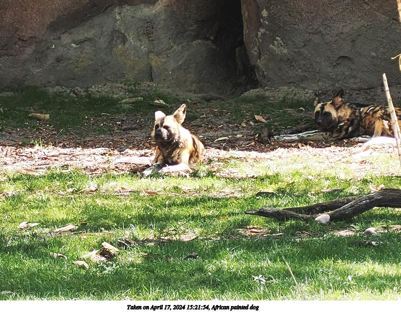 Picture #3: African painted dog Thumb: 400x300, 60,680 bytes (60K) Small: 800x623, 184,114 bytes (180K), (html file) OM OM1 camera with Olympus-m43 12-200mm f/3.5-6.3 lens f/6.3, ISO 400, 1/160 sec, 70.0mm, auto mode, vivid color, matrix metering, digital zoom x2, IS Auto, subject dogs & cats (not found), anti-shock 35mm equivalent focal length 280.0mm, digital zoom x2 Programs used: crop, raw therapee Taken by Michael Meissner on April 17, 2024 15:21:54 Last modified on May 27, 2024 at 20:50 |