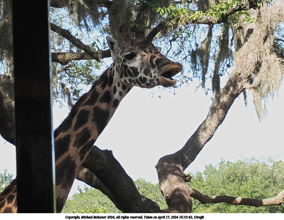 Picture #3: Giraffe Thumb: 480x360, 80,377 bytes (79K) Small: 960x743, 324,783 bytes (318K), (html file) Copyright, Michael Meissner 2024, All rights reserved OM OM1 camera with Olympus-m43 12-200mm f/3.5-6.3 lens f/9.0, ISO 200, 1/200 sec, 34.0mm, auto mode, vivid color, matrix metering, digital zoom x2, IS Auto, subject dogs & cats (not found), anti-shock 35mm equivalent focal length 136.0mm, digital zoom x2 Programs used: crop, raw therapee Taken by Michael Meissner on April 17, 2024 15:24:02 Last modified on May 27, 2024 at 16:02 |