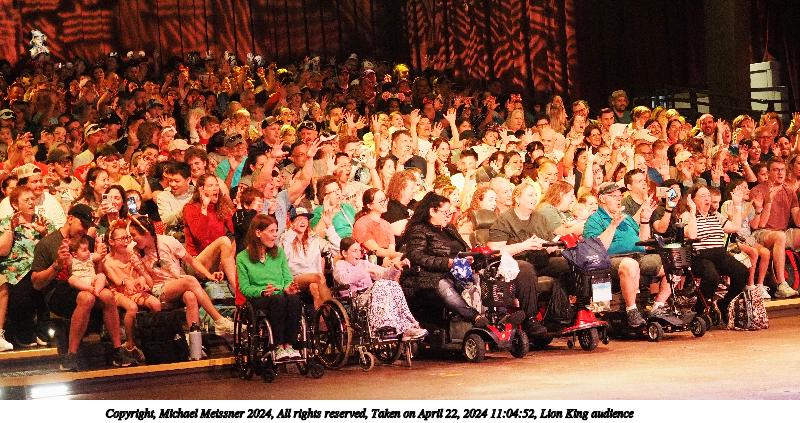 Picture #3: Lion King audience Thumb: 400x200, 48,714 bytes (48K) Small: 800x423, 130,183 bytes (128K), (html file) Copyright, Michael Meissner 2024, All rights reserved Olympus E-M5-III camera with Olympus-m43 12-40mm f/2.8 lens f/2.8, ISO 3200, 1/60 sec, 32.0mm, auto mode, vivid color, SHQ, matrix metering, continous focus, IS Auto, face detection, anti-shock 35mm equivalent focal length 64.0mm Programs used: crop, gimp, raw therapee Taken by Michael Meissner on April 22, 2024 11:04:52 Last modified on May 18, 2024 at 20:10 |