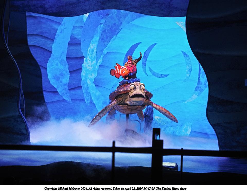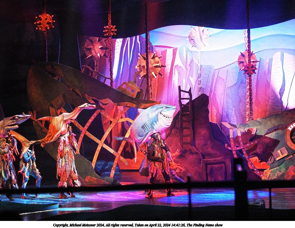 Picture #2: The Finding Nemo show #2 Thumb: 480x360, 64,342 bytes (63K) Small: 960x743, 204,761 bytes (200K), (html file) Copyright, Michael Meissner 2024, All rights reserved Olympus E-M5-III camera with Olympus-m43 12-40mm f/2.8 lens f/3.2, ISO 200, 1/100 sec, 40.0mm, auto mode, vivid color, SHQ, center weight metering, bias -0.7, continous focus, IS Auto, face detection, anti-shock 35mm equivalent focal length 80.0mm Programs used: crop, raw therapee Taken by Michael Meissner on April 22, 2024 14:36:01 Last modified on May 18, 2024 at 21:16 |