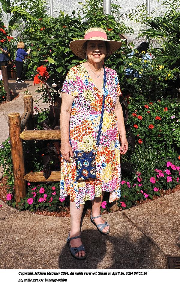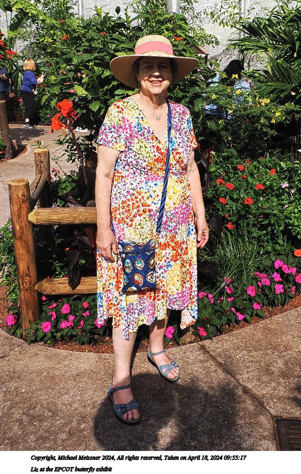 Picture #1: Liz at the EPCOT butterfly exhibit Thumb: 267x400, 63,312 bytes (62K) Small: 600x946, 255,955 bytes (250K), (html file) Copyright, Michael Meissner 2024, All rights reserved OM OM1 camera with Olympus-m43 12-200mm f/3.5-6.3 lens f/8.0, ISO 200, 1/320 sec, 12.0mm, auto mode, vivid color, matrix metering, bias -0.3, continous focus, IS Auto 35mm equivalent focal length 24.0mm Programs used: crop, gimp, raw therapee, rotate left Taken by Michael Meissner on April 18, 2024 09:55:15 Last modified on April 29, 2024 at 21:04 This picture is one of my favorites. |