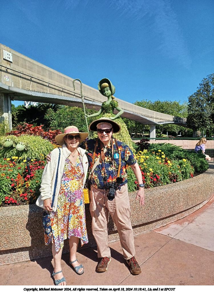 Picture #8: Liz and I at EPCOT #2 Thumb: 375x500, 52,669 bytes (52K) Small: 750x1023, 233,324 bytes (228K), (html file) Copyright, Michael Meissner 2024, All rights reserved Samsung A32 5G phone f/1.8, ISO 32, 1/585 sec, 4.6mm, auto mode, center weight metering 35mm equivalent focal length 25.0mm Programs used: raw therapee, rotate right Taken by Michael Meissner on April 18, 2024 10:18:41 Last modified on April 29, 2024 at 21:21 |