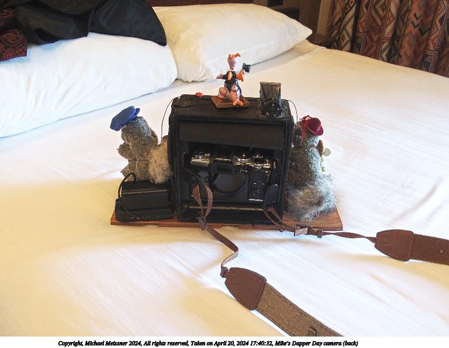 Picture #11: Mike's Dapper Day camera (front) Thumb: 400x300, 33,753 bytes (33K) Small: 900x698, 97,846 bytes (96K), (html file) Copyright, Michael Meissner 2024, All rights reserved Olympus Stylus-1 camera f/2.8, ISO 800, 1/50 sec, 10.8mm, auto mode, natural color, center weight metering, IS Auto, noise reduction auto 35mm equivalent focal length 50.0mm Programs used: crop, gimp, raw therapee Taken by Michael Meissner on April 20, 2024 17:38:41 Last modified on April 29, 2024 at 22:13 |