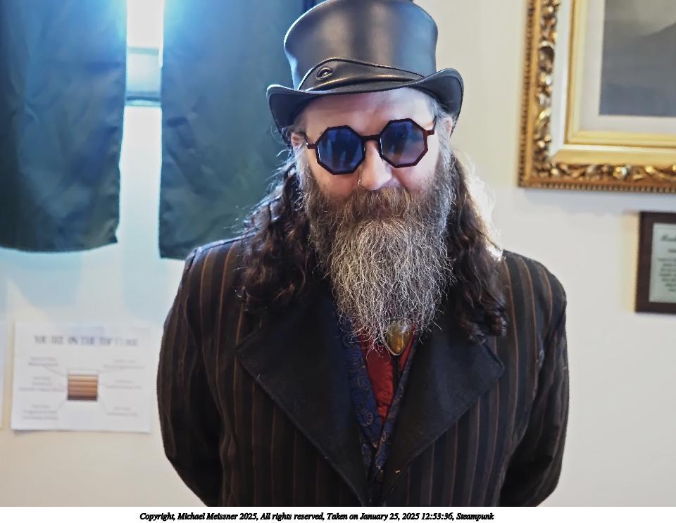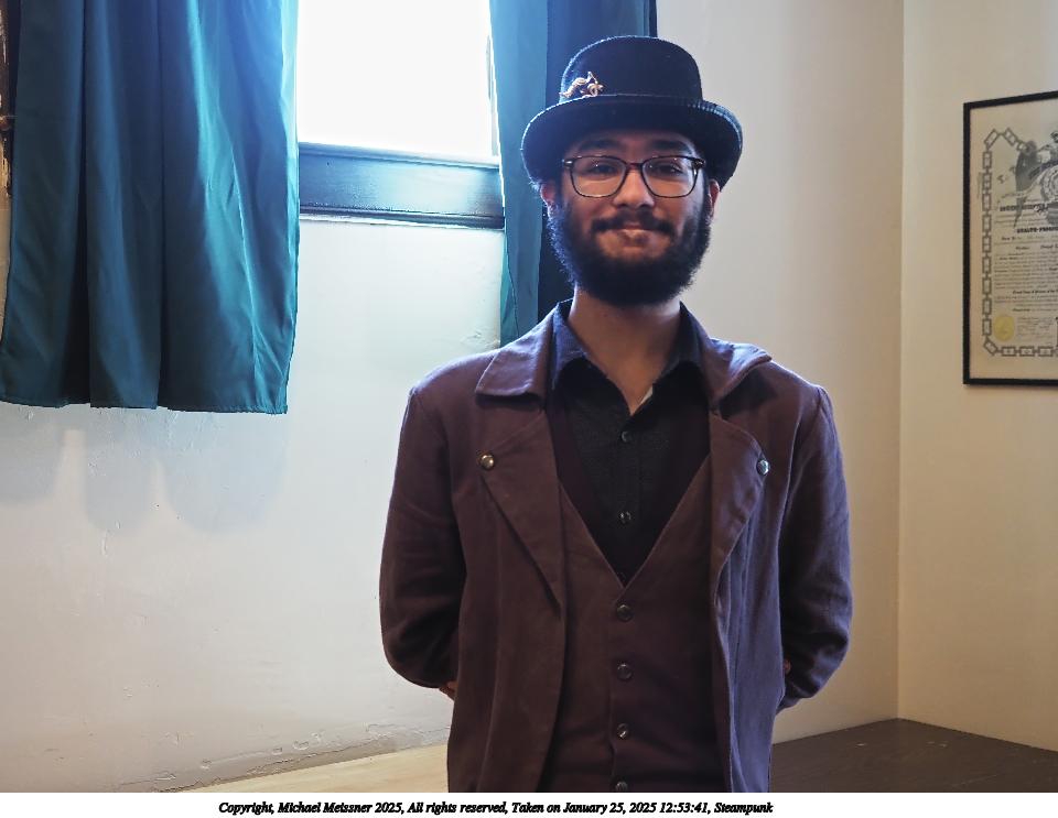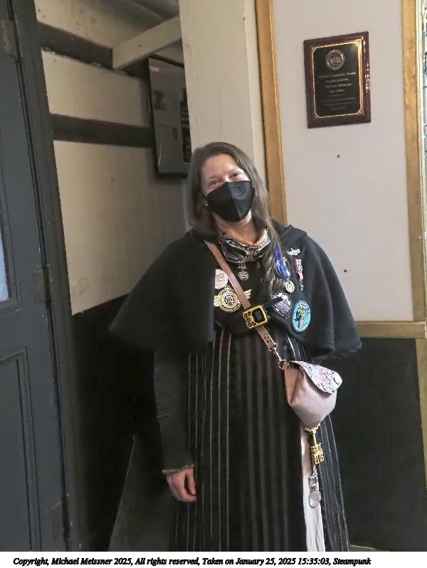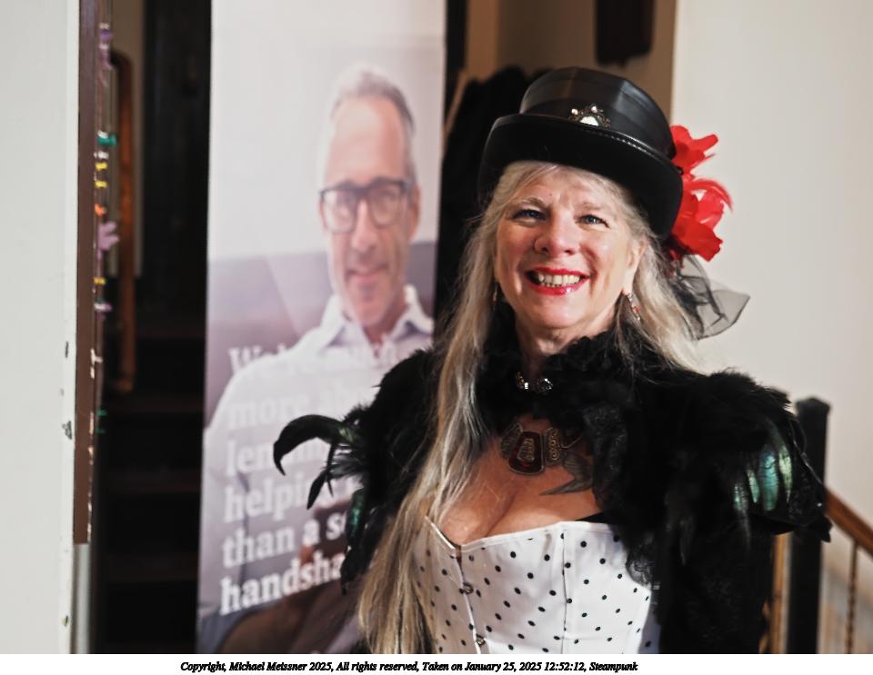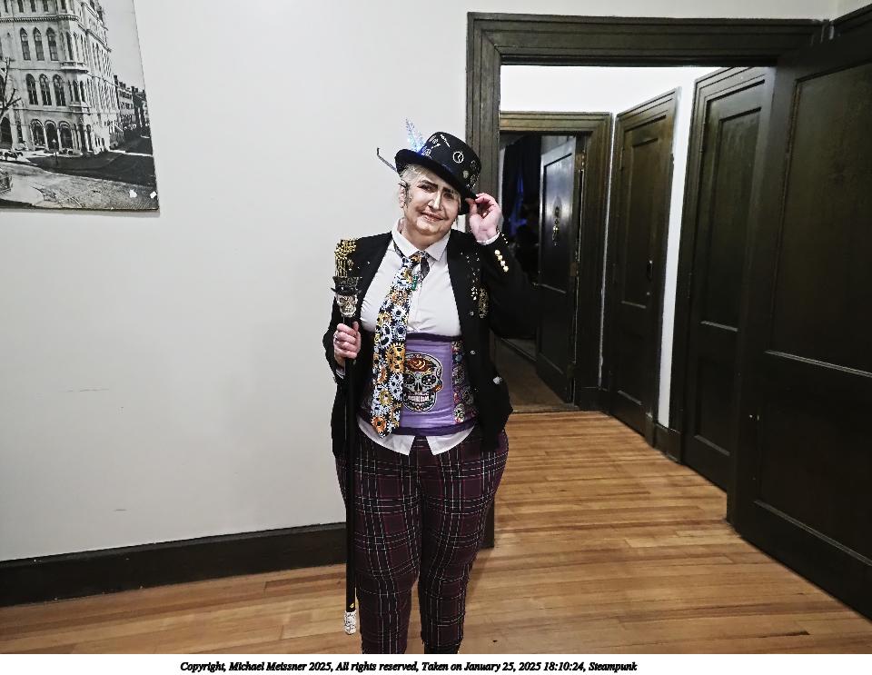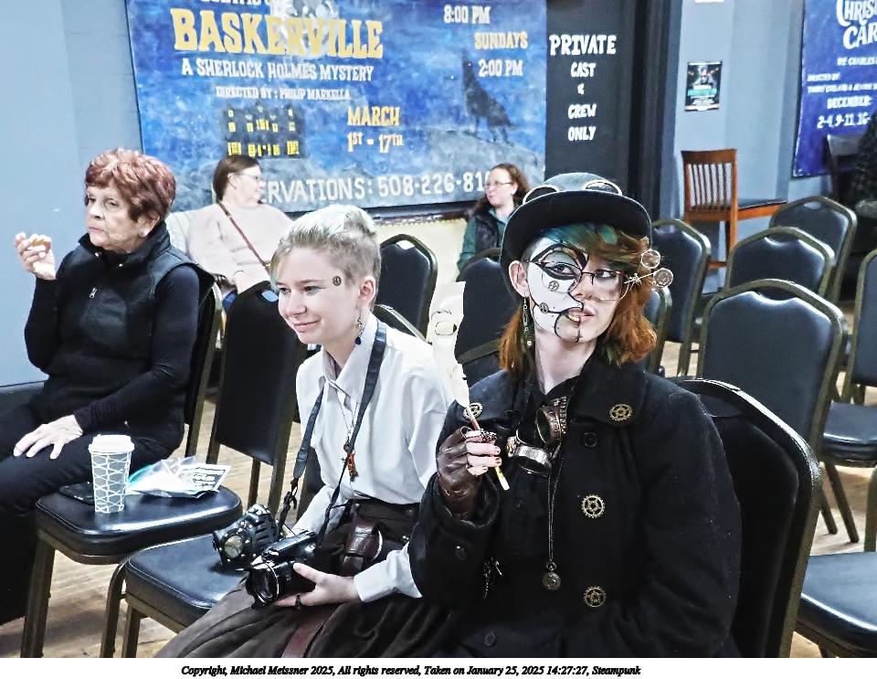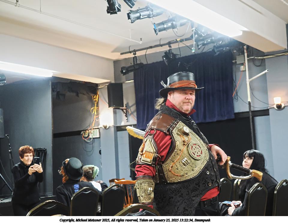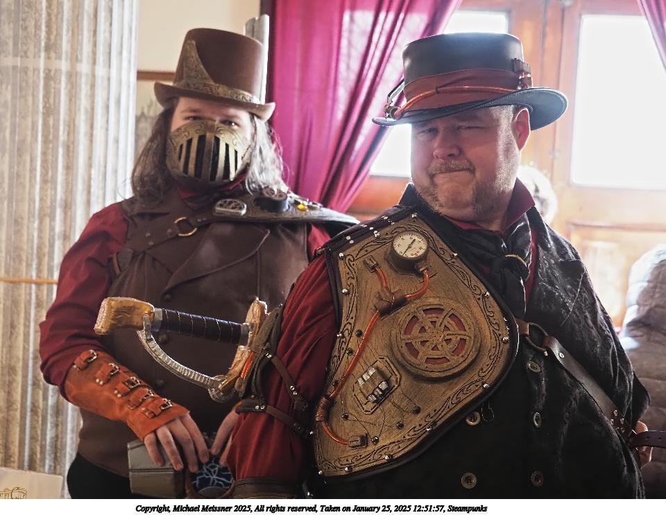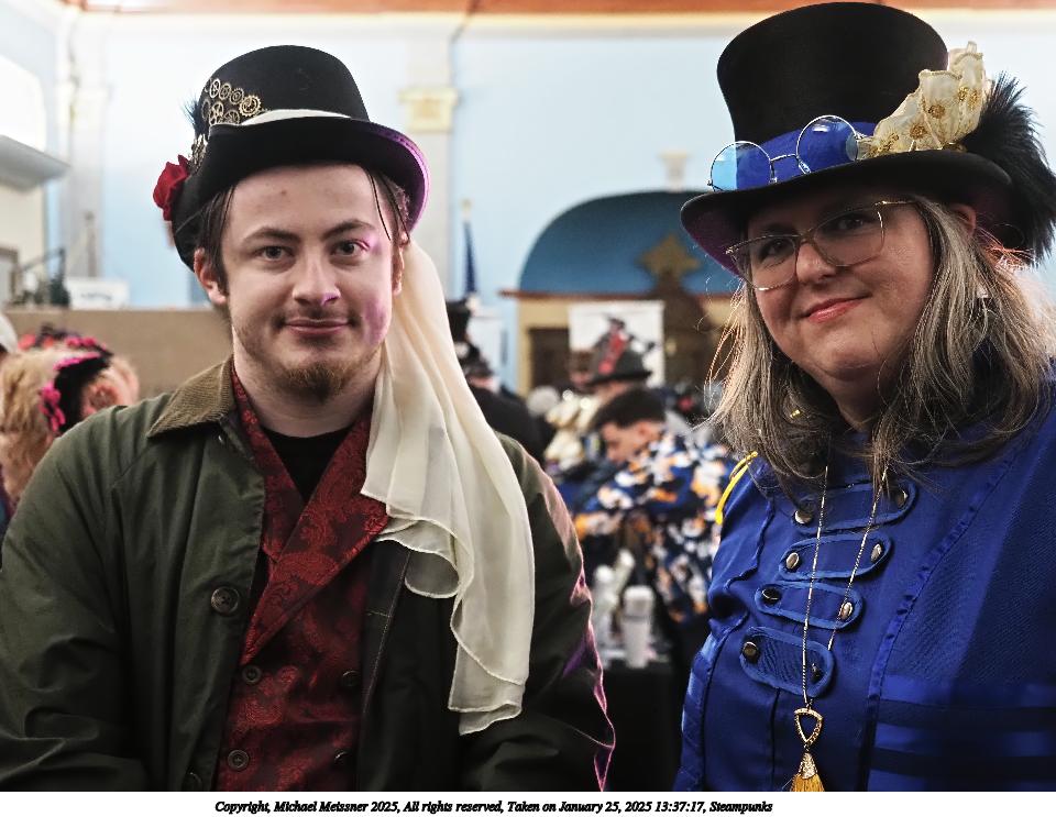Picture #63: Steampuks Small: 960x743, 183,251 bytes (179K), (html file) Large: 4800x3600, 3,782,070 bytes (3.6M), (html file) Copyright, Michael Meissner 2025, All rights reserved Olympus E-M1-II camera with Olympus-m43 12-40mm f/2.8 lens f/2.8, ISO 2500, 1/60 sec, 12.0mm, auto mode, natural color, SHQ, matrix metering, digital zoom x2, continous focus, IS Auto, both eyes priority, face detection, anti-shock 35mm equivalent focal length 48.0mm, digital zoom x2 Programs used: crop, raw therapee Taken by Michael Meissner on January 25, 2025 14:27:46 Last modified on February 01, 2025 at 20:00 |