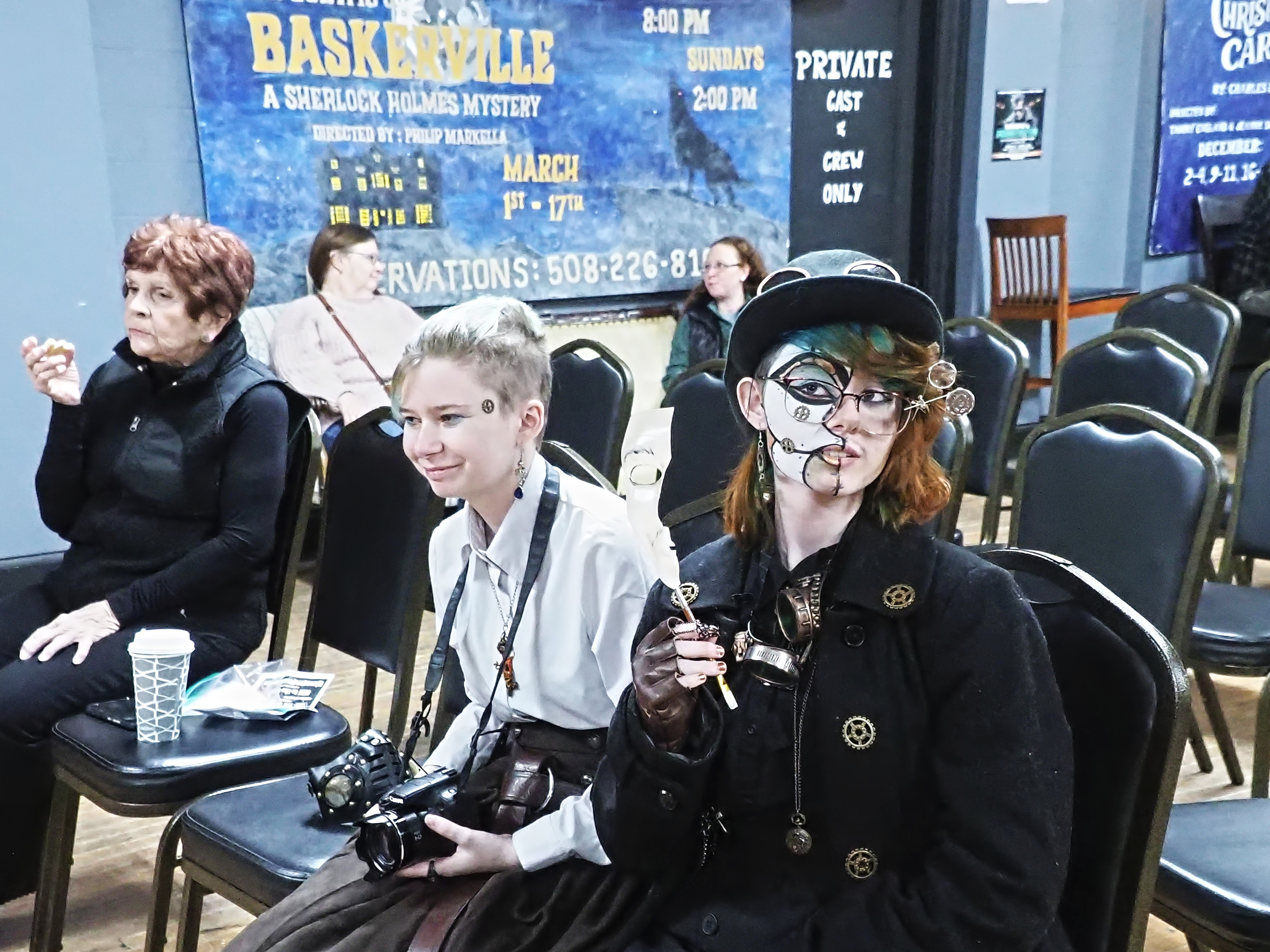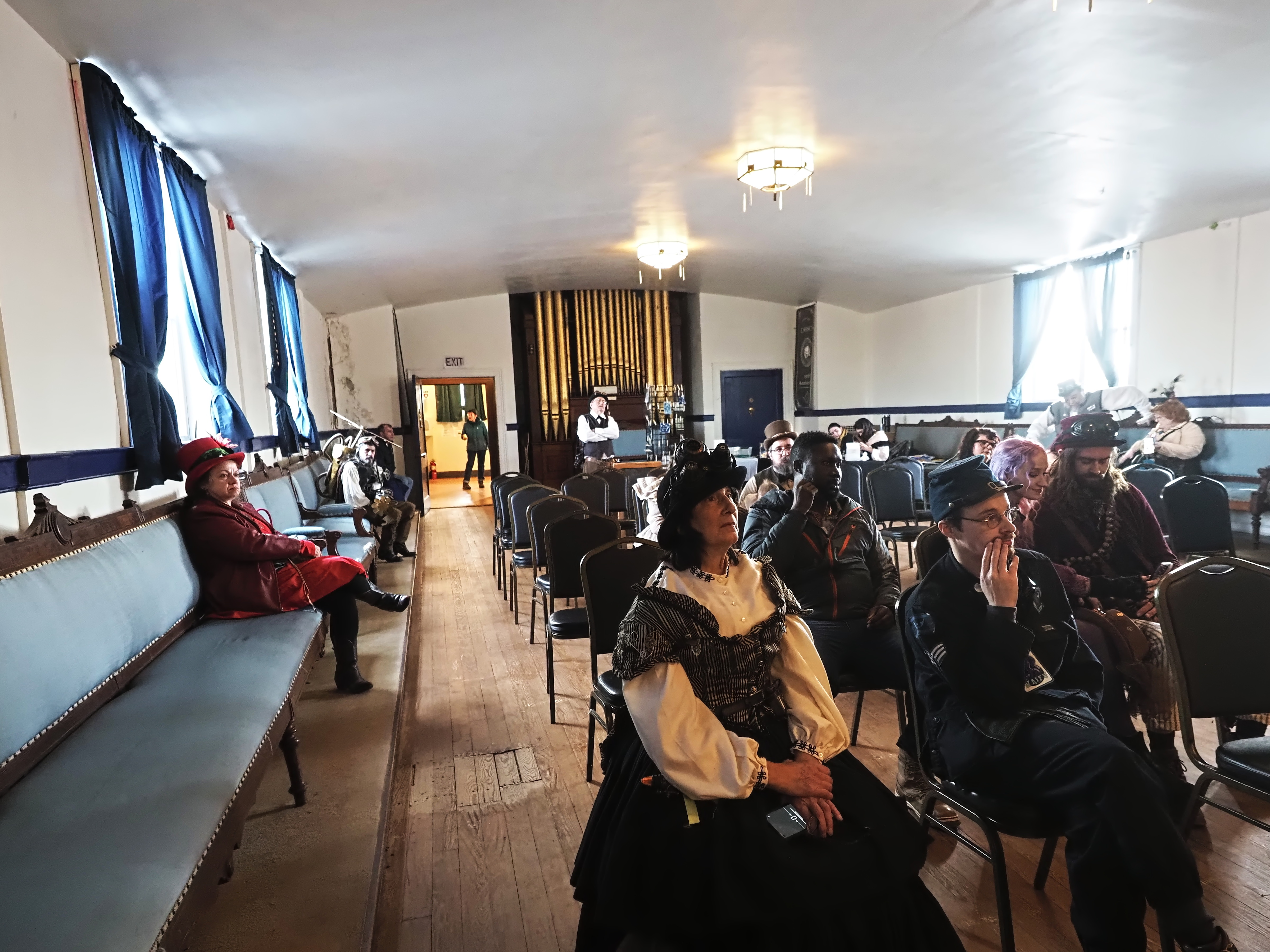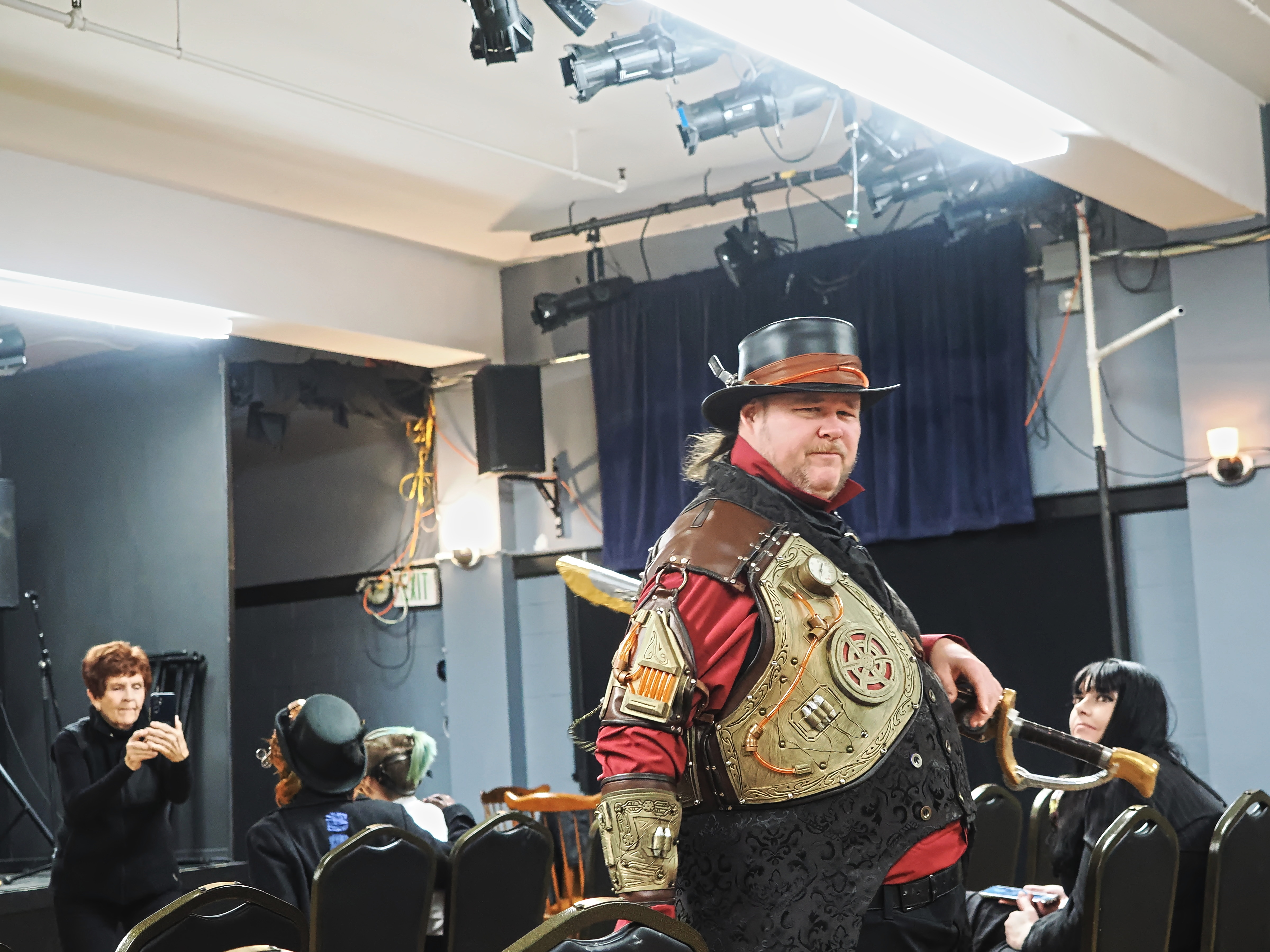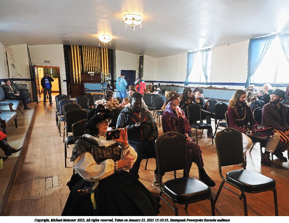 Picture #67: Steampunk Powerpoint Karaoke audience Small: 960x743, 157,274 bytes (154K), (html file) Large: 4800x3600, 3,199,237 bytes (3.1M), (html file) Copyright, Michael Meissner 2025, All rights reserved OM OM1 camera with Olympus-m43 12-40mm f/2.8 lens f/2.8, ISO 2500, 1/60 sec, 12.0mm, auto mode, vivid color, matrix metering, continous focus, IS Auto, face detection, anti-shock 35mm equivalent focal length 24.0mm Programs used: crop, raw therapee Taken by Michael Meissner on January 25, 2025 15:10:35 Last modified on February 01, 2025 at 20:02 |