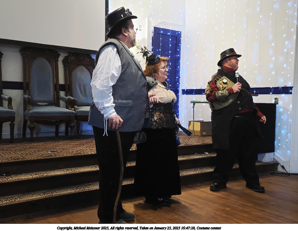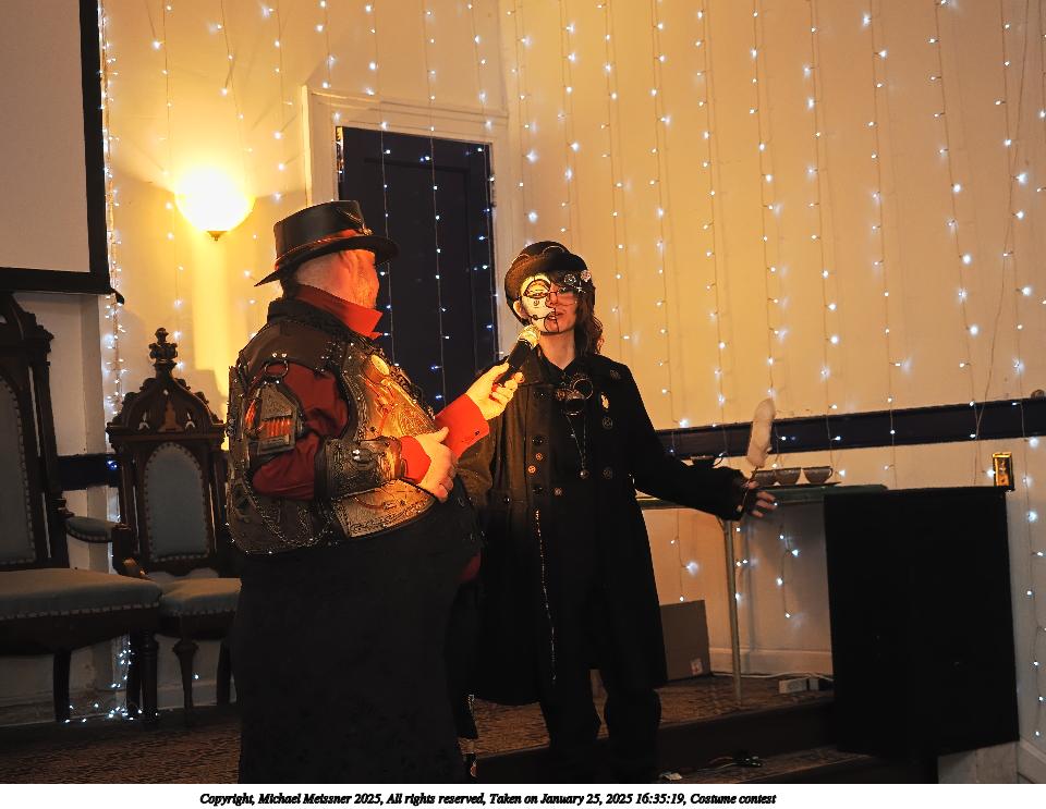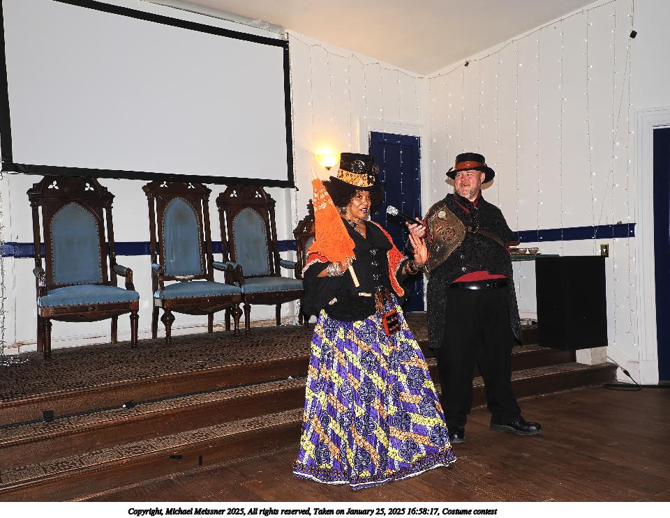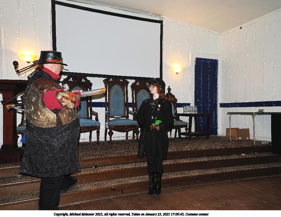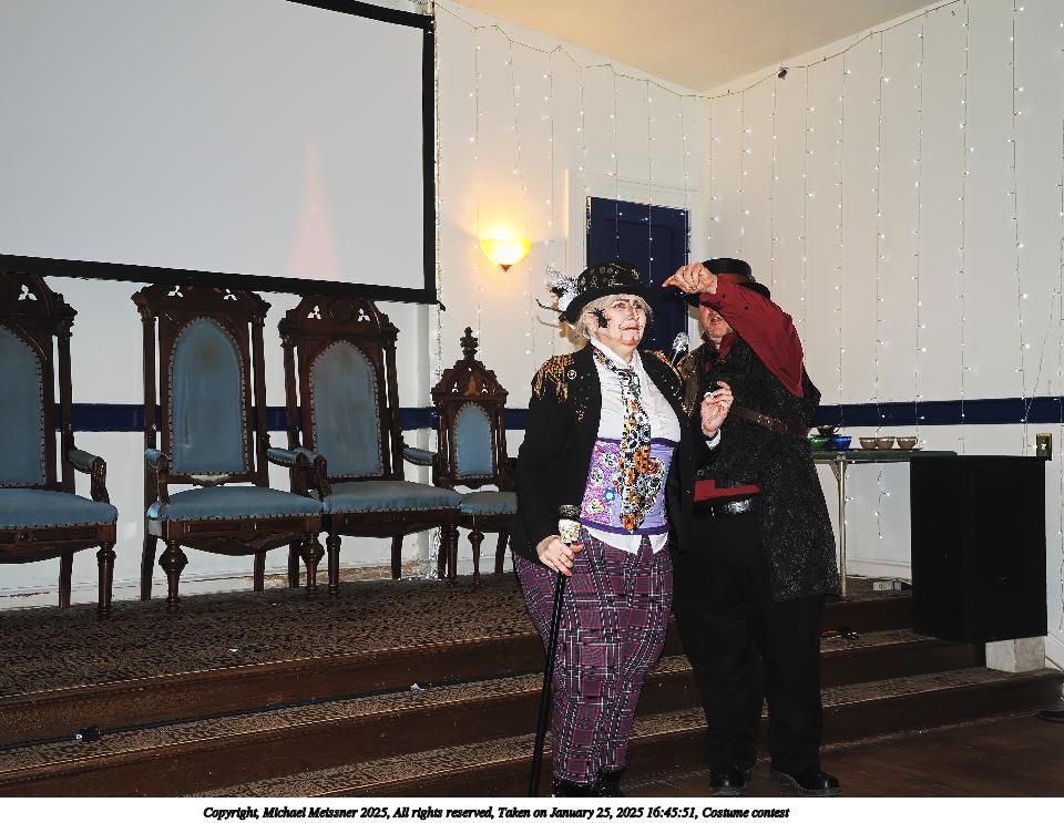 Picture #94: Costume contest #17 Small: 960x743, 161,087 bytes (158K), (html file) Large: 4800x3600, 3,186,744 bytes (3.0M), (html file) Copyright, Michael Meissner 2025, All rights reserved OM OM1 camera with Olympus-m43 12-40mm f/2.8 lens f/2.8, ISO 200, flash, 1/60 sec, 15.0mm, auto mode, vivid color, matrix metering, continous focus, IS Auto, face detection, anti-shock 35mm equivalent focal length 30.0mm Programs used: crop, raw therapee Taken by Michael Meissner on January 25, 2025 16:57:01 Last modified on February 01, 2025 at 20:18 |