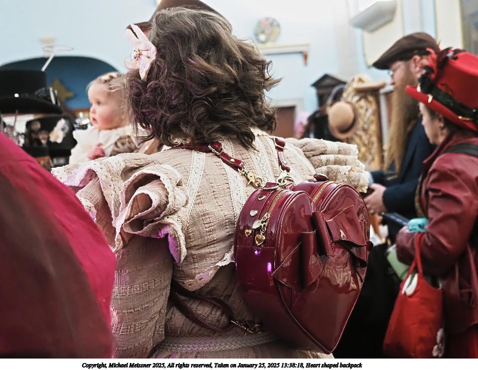 Picture #28: Heart shaped backpack Small: 960x743, 138,204 bytes (135K), (html file) Large: 4800x3600, 2,688,405 bytes (2.6M), (html file) Copyright, Michael Meissner 2025, All rights reserved Olympus E-M1-II camera with Olympus-m43 12-40mm f/2.8 lens f/2.8, ISO 4000, 1/60 sec, 27.0mm, auto mode, natural color, SHQ, matrix metering, continous focus, IS Auto, both eyes priority, face detection, anti-shock 35mm equivalent focal length 54.0mm Programs used: crop, raw therapee Taken by Michael Meissner on January 25, 2025 13:38:18 Last modified on February 01, 2025 at 19:01 |
