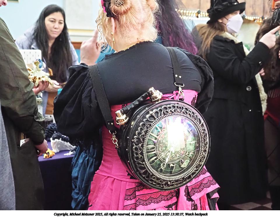 Picture #29: Watch backpack Small: 960x743, 143,377 bytes (141K), (html file) Large: 4800x3600, 2,666,882 bytes (2.5M), (html file) Copyright, Michael Meissner 2025, All rights reserved Olympus E-M1-II camera with Olympus-m43 12-40mm f/2.8 lens f/2.8, ISO 6400, 1/60 sec, 27.0mm, auto mode, natural color, SHQ, matrix metering, continous focus, IS Auto, both eyes priority, face detection, anti-shock 35mm equivalent focal length 54.0mm Programs used: crop, raw therapee Taken by Michael Meissner on January 25, 2025 13:38:37 Last modified on February 01, 2025 at 19:01 |