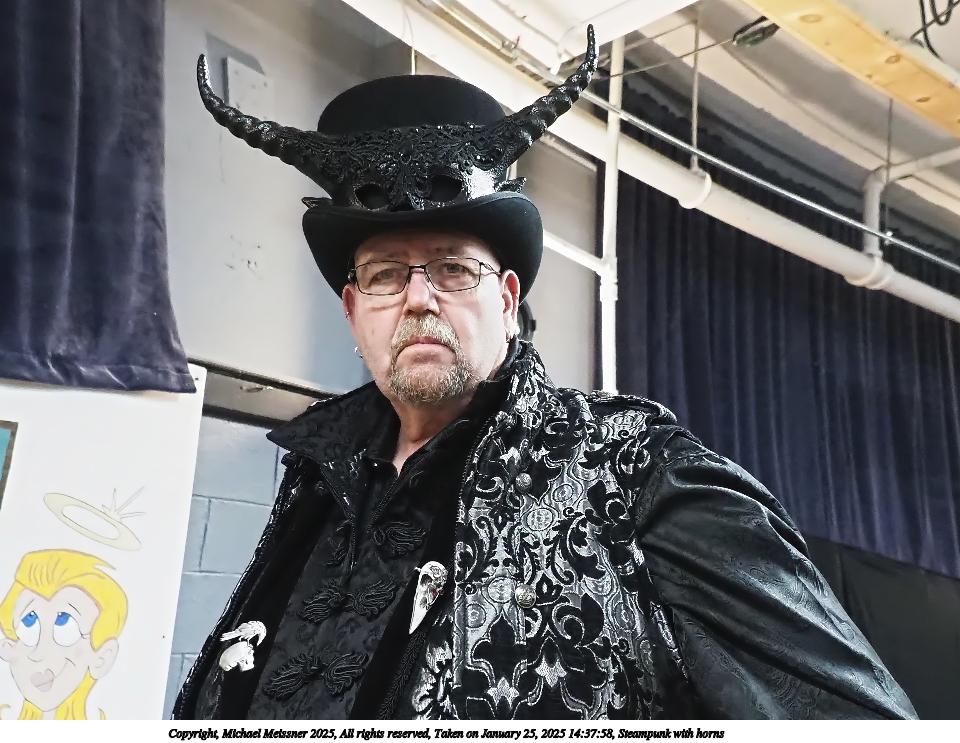 Picture #65: Steampunk with horns Small: 960x743, 140,455 bytes (138K), (html file) Large: 4800x3600, 2,327,304 bytes (2.2M), (html file) Copyright, Michael Meissner 2025, All rights reserved Olympus E-M1-II camera with Olympus-m43 12-40mm f/2.8 lens f/2.8, ISO 3200, 1/60 sec, 12.0mm, auto mode, natural color, SHQ, matrix metering, digital zoom x2, continous focus, IS Auto, both eyes priority, face detection, anti-shock 35mm equivalent focal length 48.0mm, digital zoom x2 Programs used: crop, raw therapee Taken by Michael Meissner on January 25, 2025 14:37:58 Last modified on February 01, 2025 at 20:00 |