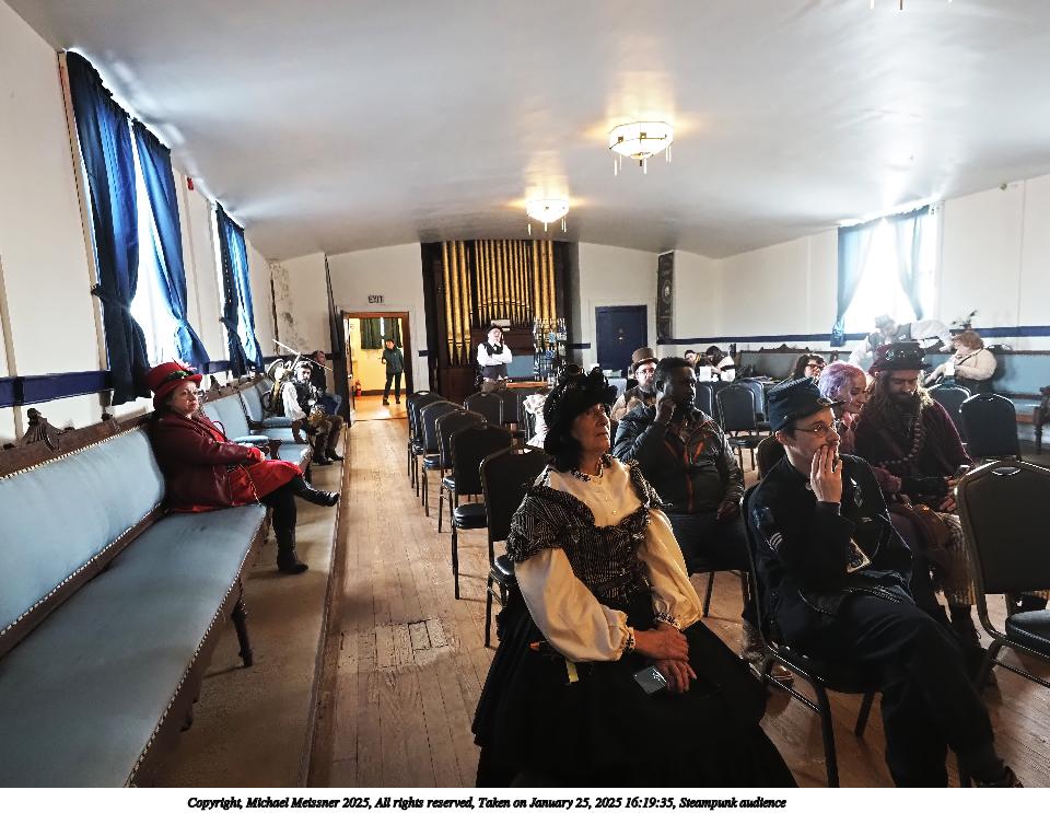 Picture #70: Steampunk audience Small: 960x743, 130,981 bytes (128K), (html file) Large: 4800x3600, 2,676,293 bytes (2.6M), (html file) Copyright, Michael Meissner 2025, All rights reserved Olympus E-M1-II camera with Olympus-m43 12-40mm f/2.8 lens f/2.8, ISO 2000, 1/60 sec, 12.0mm, auto mode, natural color, SHQ, matrix metering, continous focus, IS Auto, both eyes priority, face detection, anti-shock 35mm equivalent focal length 24.0mm Programs used: crop, raw therapee Taken by Michael Meissner on January 25, 2025 16:19:35 Last modified on February 01, 2025 at 20:07 |